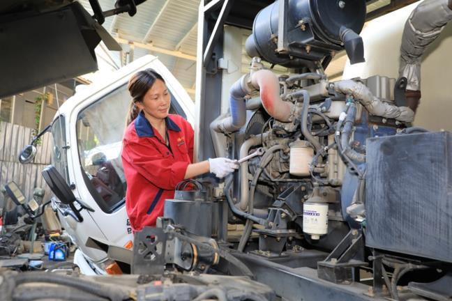 张小兰在维修环卫车辆