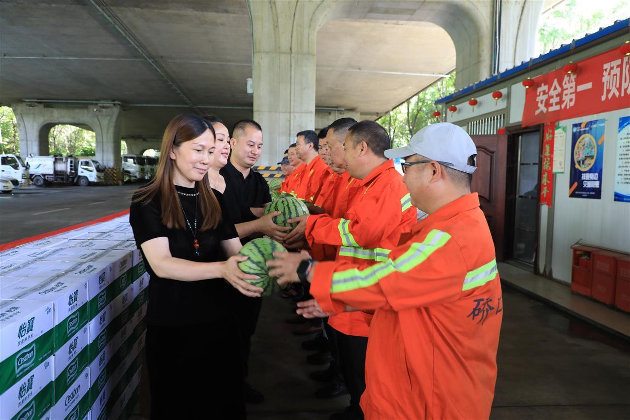 西瓜解暑,瓶装水解渴。5月30日,武汉市硚口区福新环卫设施维修站联合武汉福心有限责任公司和盈峰环境公司开展“夏日送清凉”慰问活动,向硚口区环卫工人送去300箱瓶装水和2000斤西瓜,表达慰问和关爱之情。