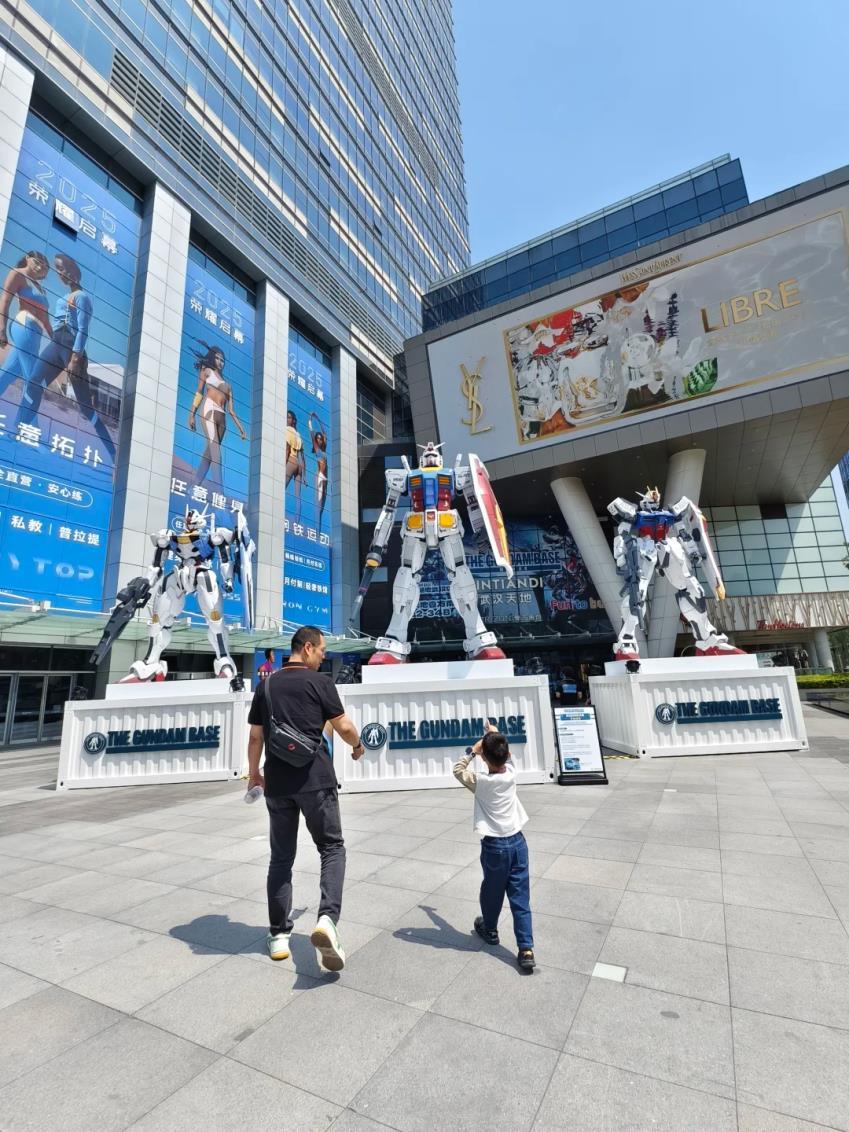 武汉天地壹方南馆外,“高达基地”湖北首展正如火如荼地举办着,巨大的机甲模型巍然屹立,引来无数游客围观,80后的父亲带着儿子合影打卡,直呼“青春回来了”。