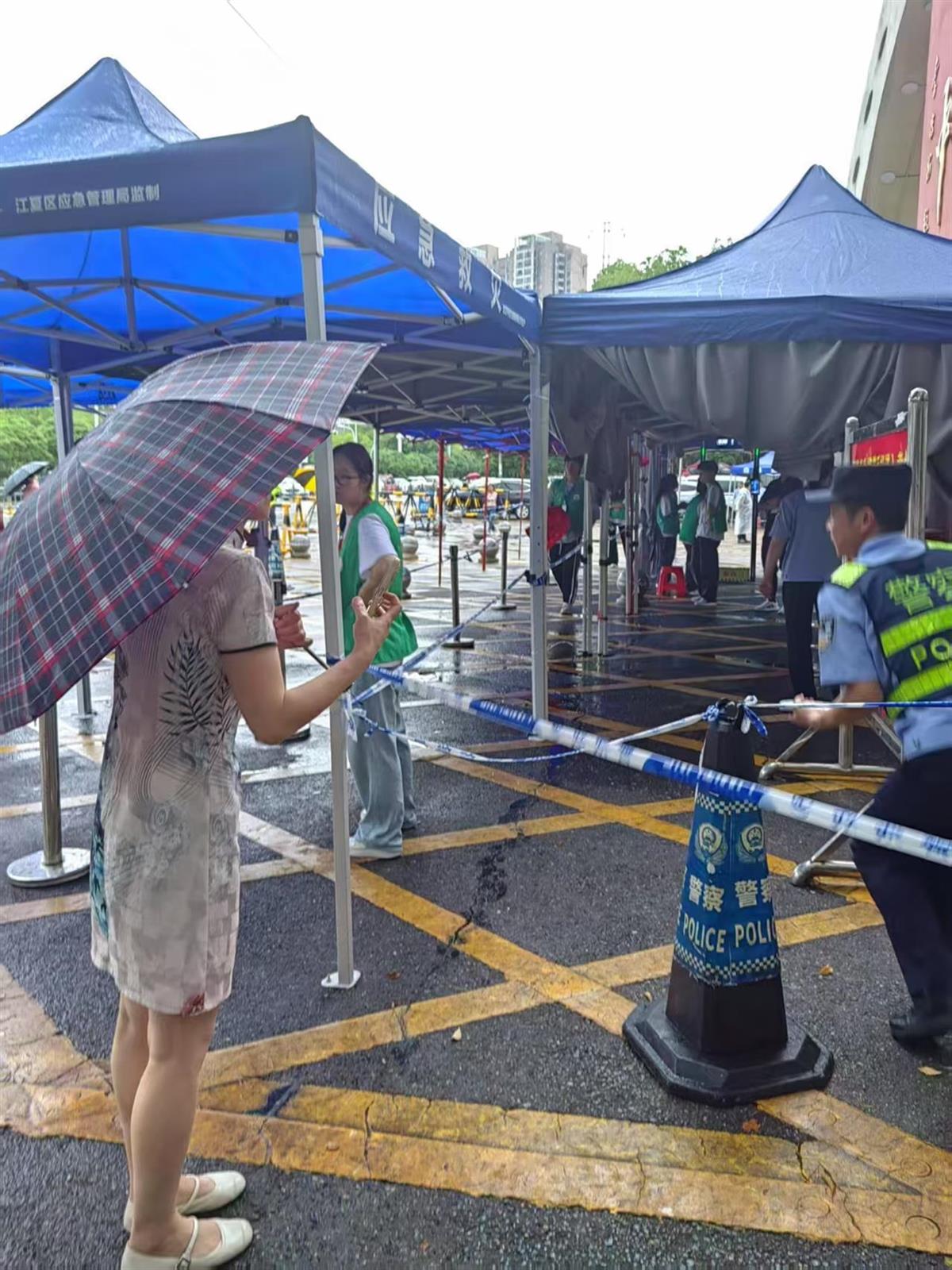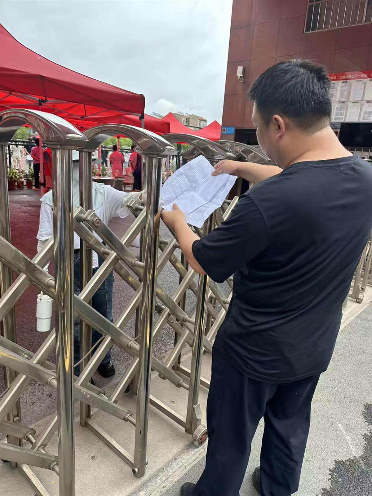 面对突发状况,执勤警力化身考场“护航人”。6月9日开考前,江夏四中一名考生因鞋子含金属无法通过安检。纸坊派出所副所长方巍果断安排志愿者取来拖鞋助其顺利入场。而在职业中学考点,郑店公安检查站、交通管理大队已连续三天接力,将考前意外腿部骨折的黎同学稳稳搀扶进出考场。