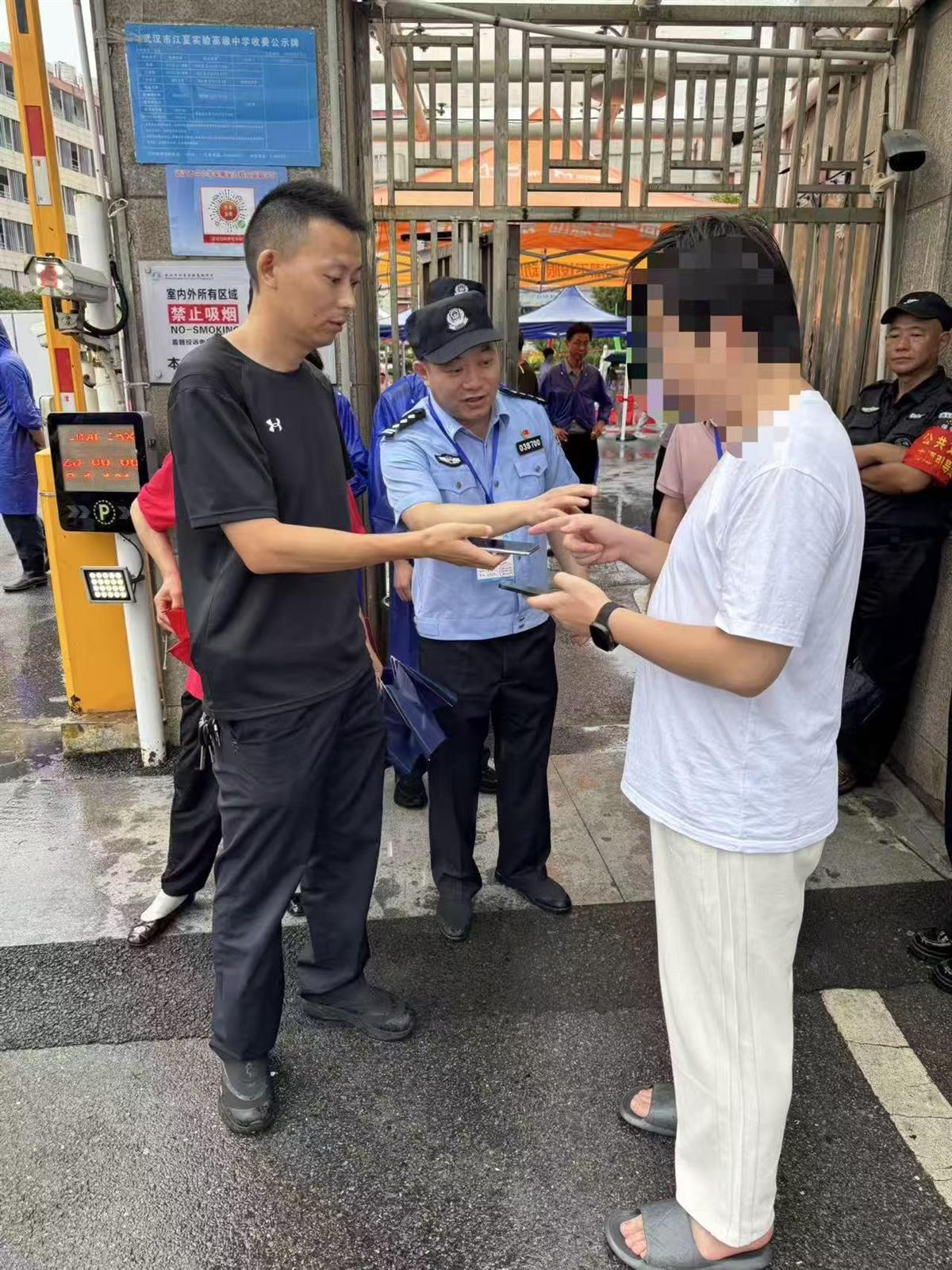 护考现场,纸坊派出所民警对考生求助的反应速度令人惊叹。高考首日中午,实验高中考点外,一名考生焦急求助,称进场前暂放在家长休息区雨棚内的手机不翼而飞。现场执勤的纸坊派出所教导员敖虎立即部署双线作战,民警李勇、朱家辉现场走访搜寻,辅警周慧杰同步逐帧排查监控。两小时紧张接力后,民警成功联系上拾取者,在下午开考前将手机完好送还考生家长手中。考生心头大石落地,信心满满重返考场。