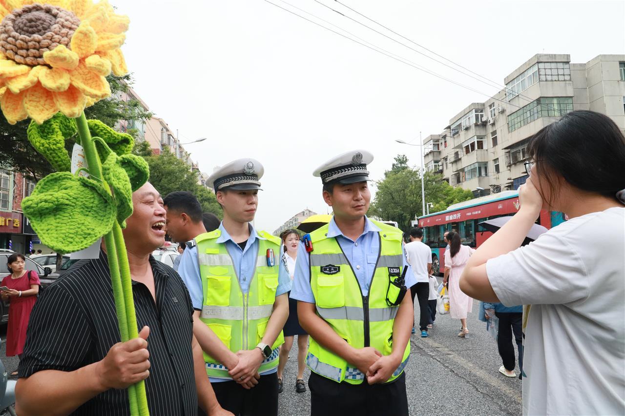 高考结束时,一名考生和家长上前与执勤警力合影留念。考生表示,自己填报志愿时也想报考警校,加入公安队伍。