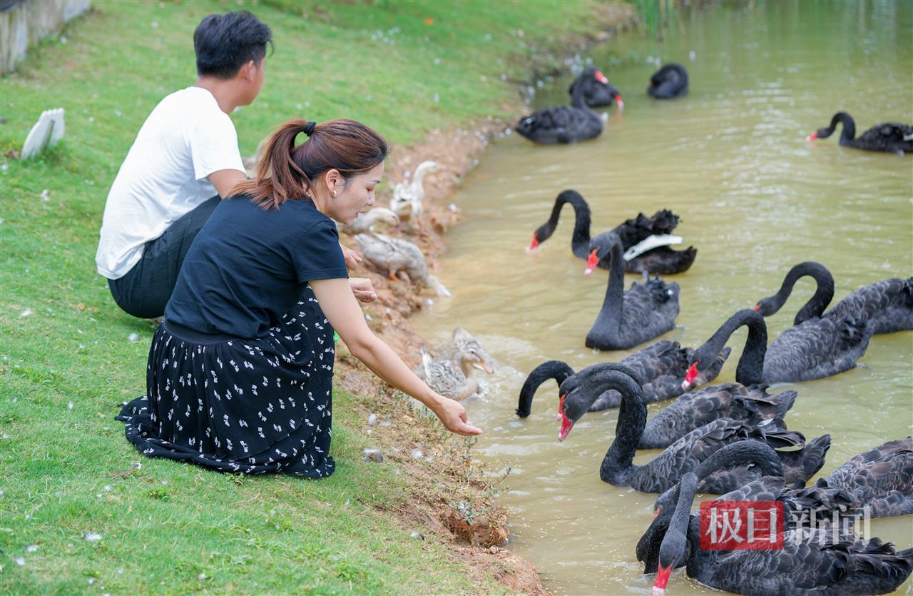 11日上午,新闻记者来到现代·天外天小镇一处湖畔拍摄,被网友称之为“渣鹅”的公天鹅正带着新欢母天鹅在湖畔玩耍。看到饲养员送来谷米,它们不停地发出叫声,随后一起进食,一起游向湖面。“没办法,它们俩又跑出来了。”游守本说道。
