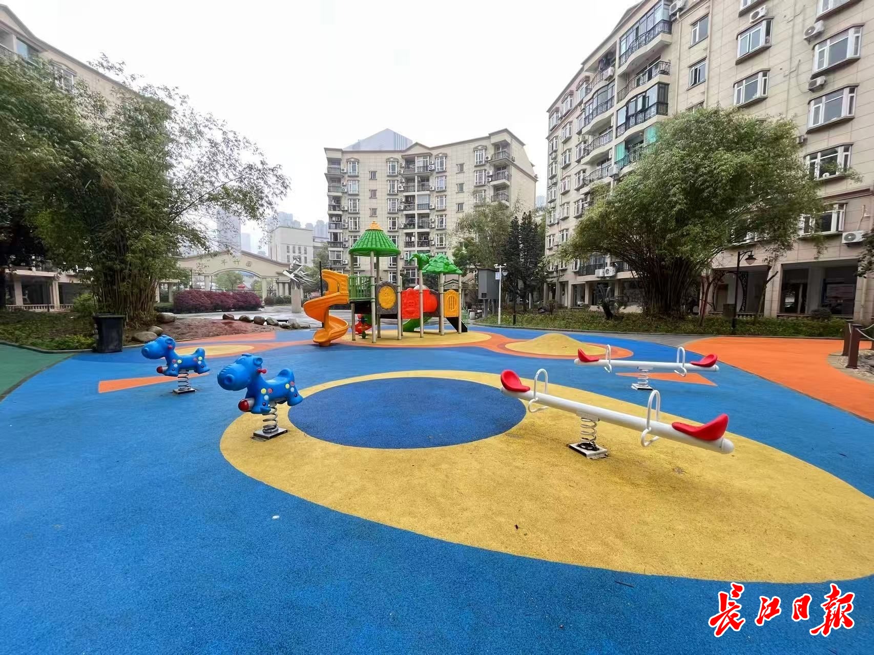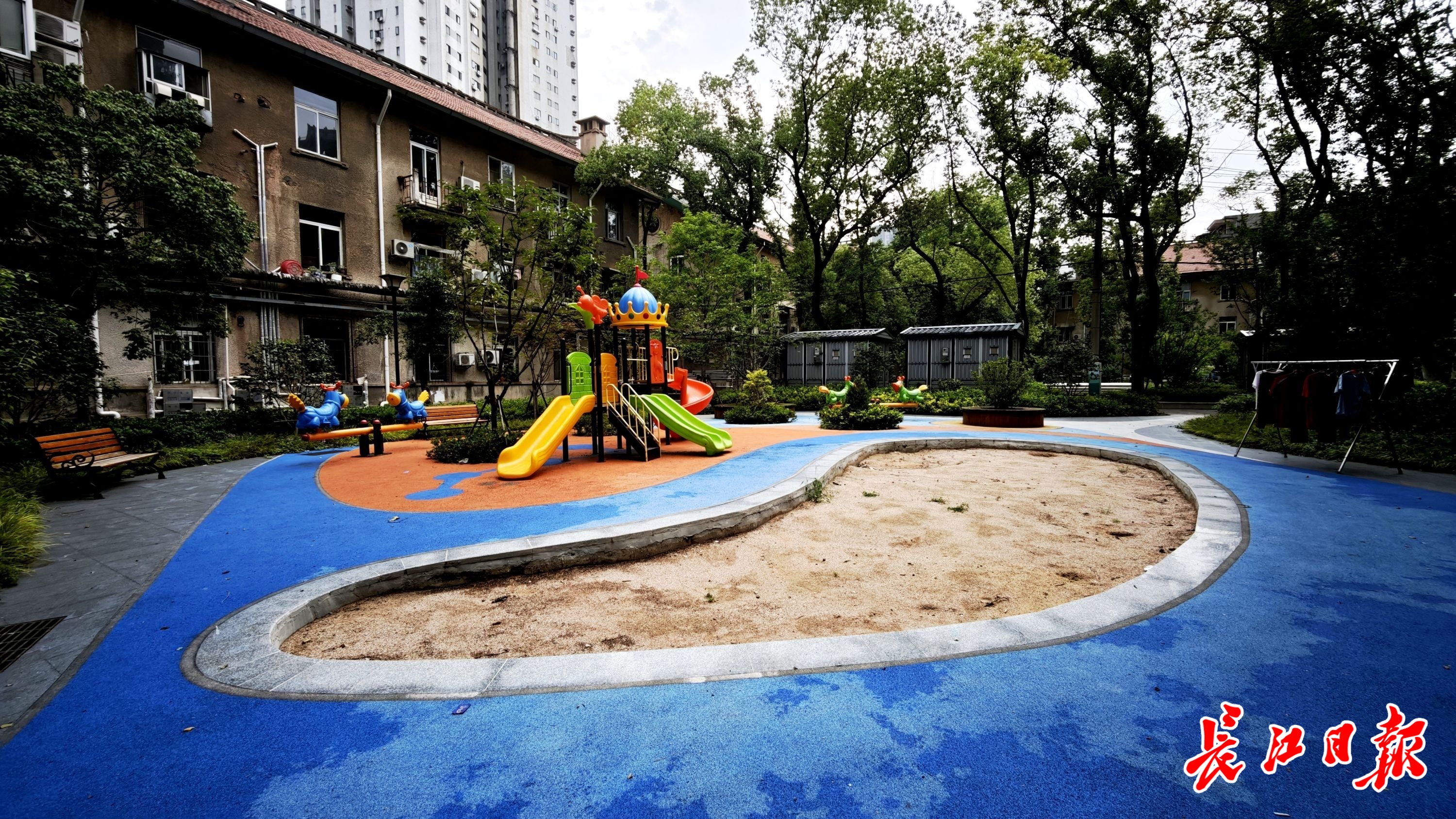6月5日,长江日报记者来到武昌区中建院小区,一眼就看到被4栋楼房包围的居民公共活动空间。这个空间由一排大树自然分隔,一边是色彩斑斓的儿童乐园和沙池,另一边是可供老人休憩聊天、举办表演的简易舞台与座椅。