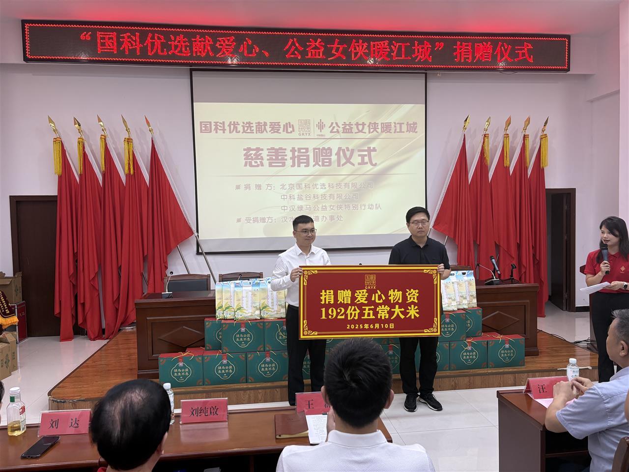 在捐赠环节中,国科优选公司和中科盐谷公司向汉水桥街道捐赠192份健康礼盒及优质大米。街道领导代表受赠方接收物资,并向两家企业回赠锦旗,以示感谢。