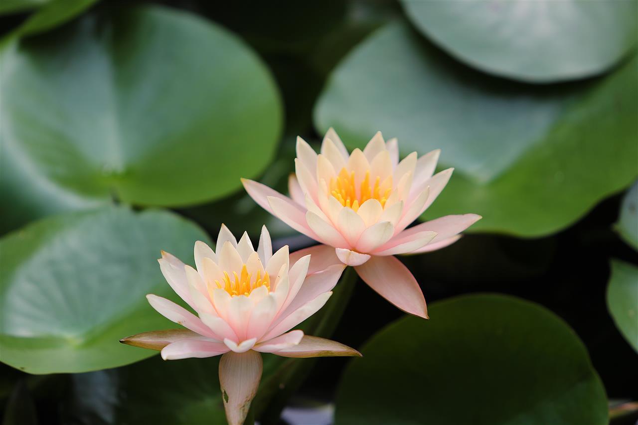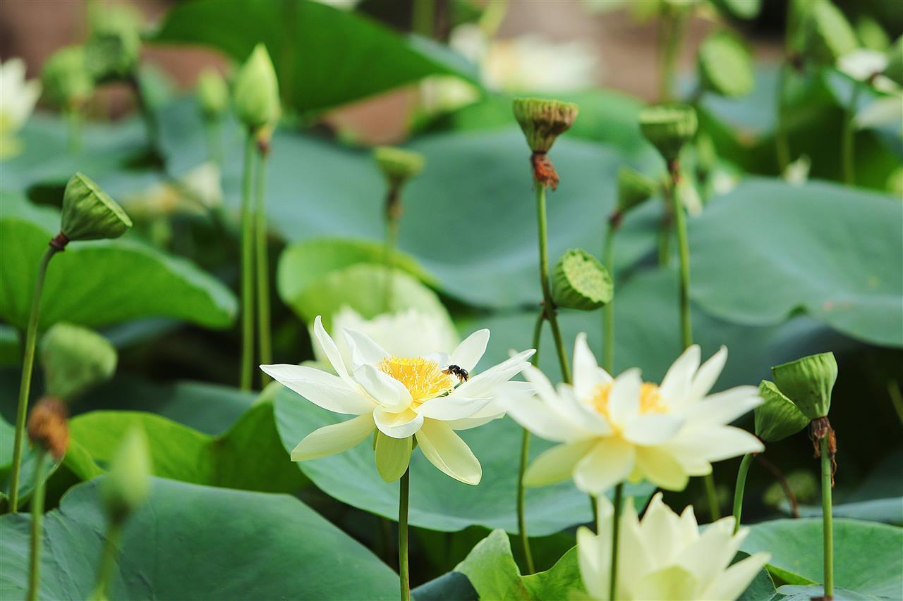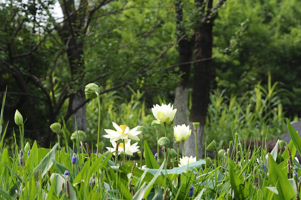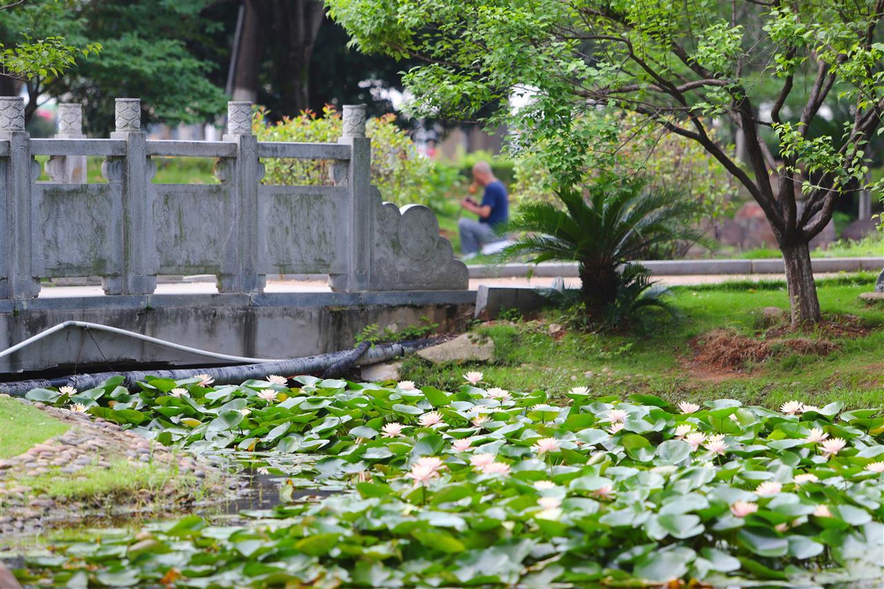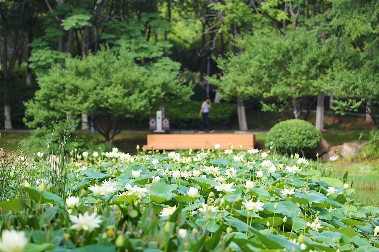 目前各大公园同期盛放的还有睡莲。素雅的白、喜庆的红、清秀的粉、明丽的黄,星星点点地散落于莲叶之间,花色绚烂,洁净俏丽。蓝天白云倒映在粼粼波光中,与悄然绽放的睡莲相映成趣,蛙鸣阵阵,莲香幽幽,共同勾勒出清新秀雅的夏日图景。