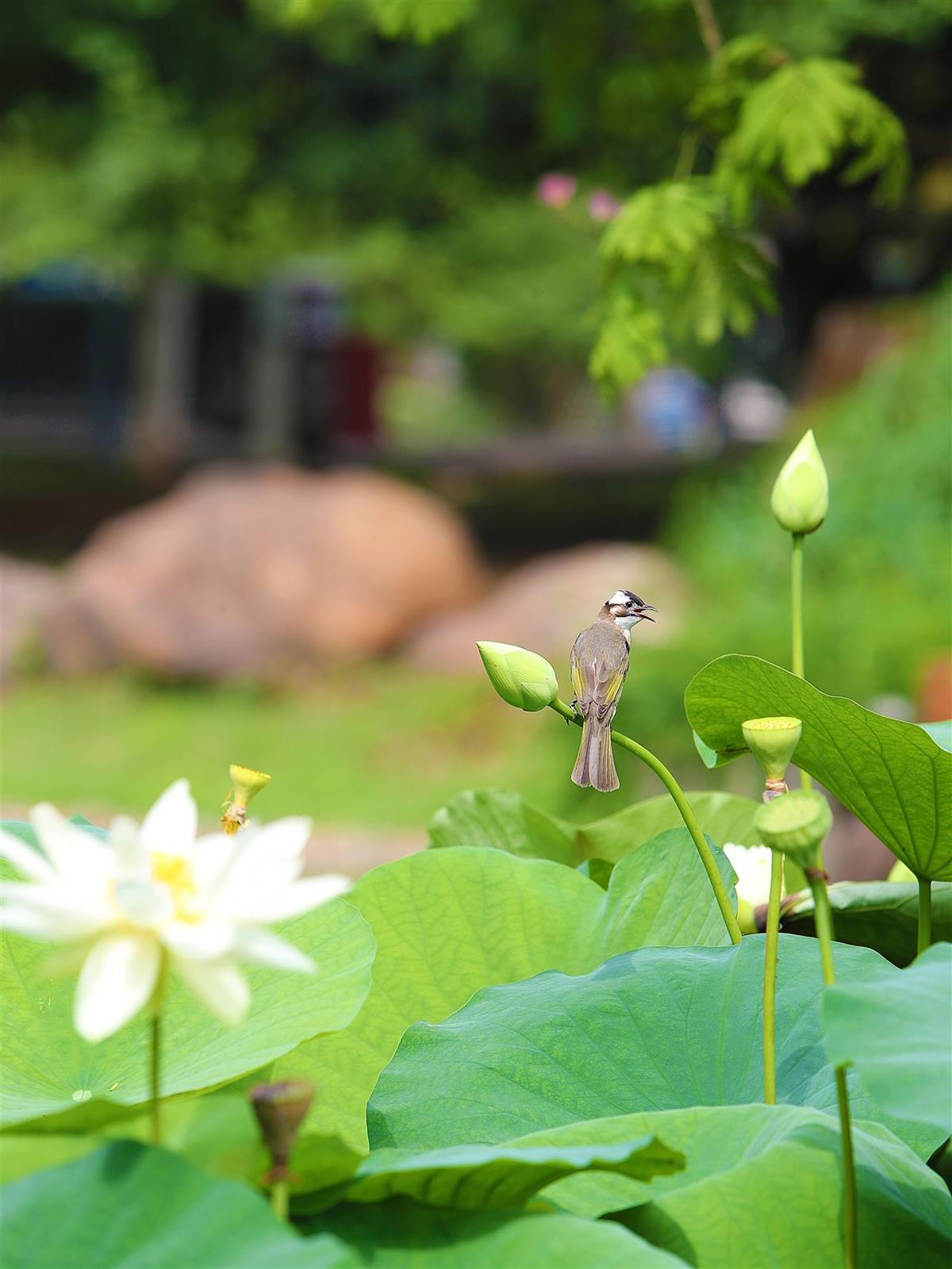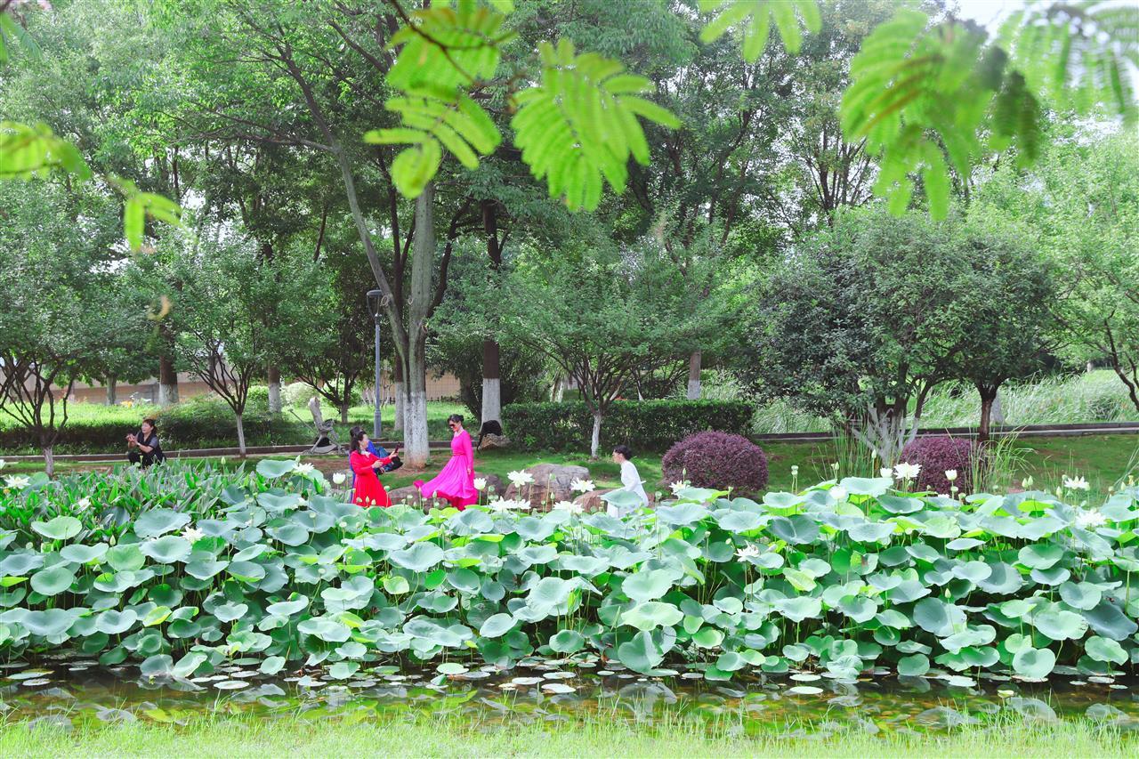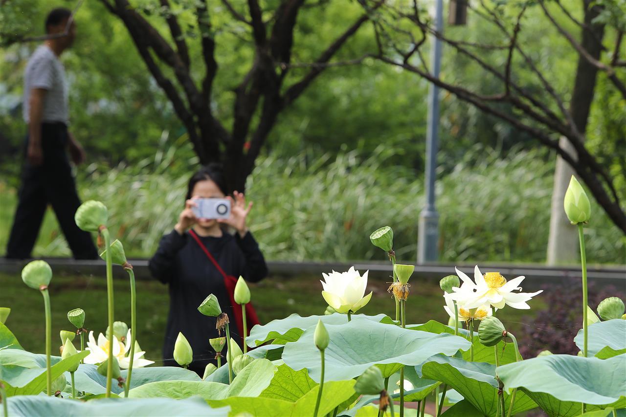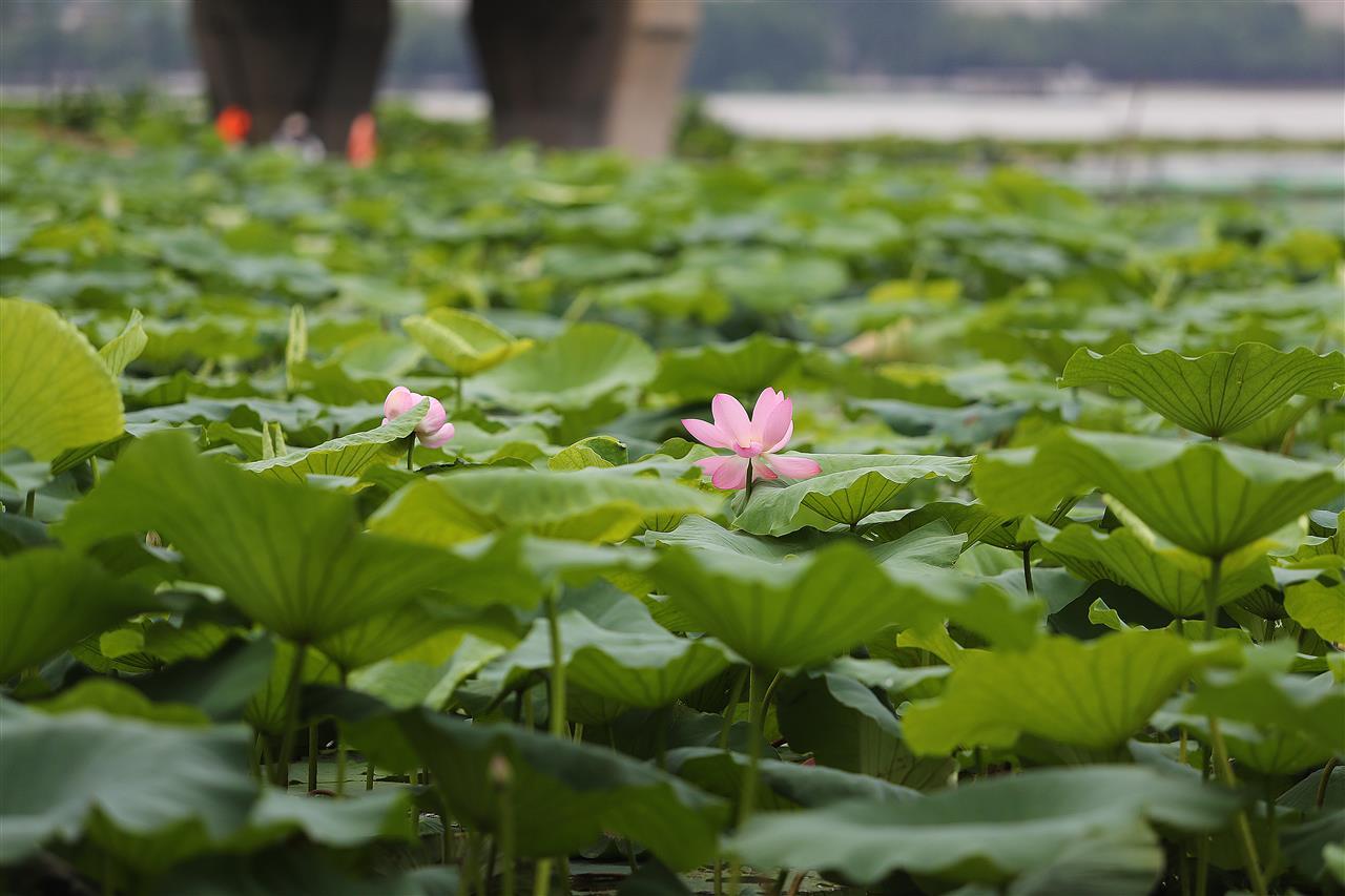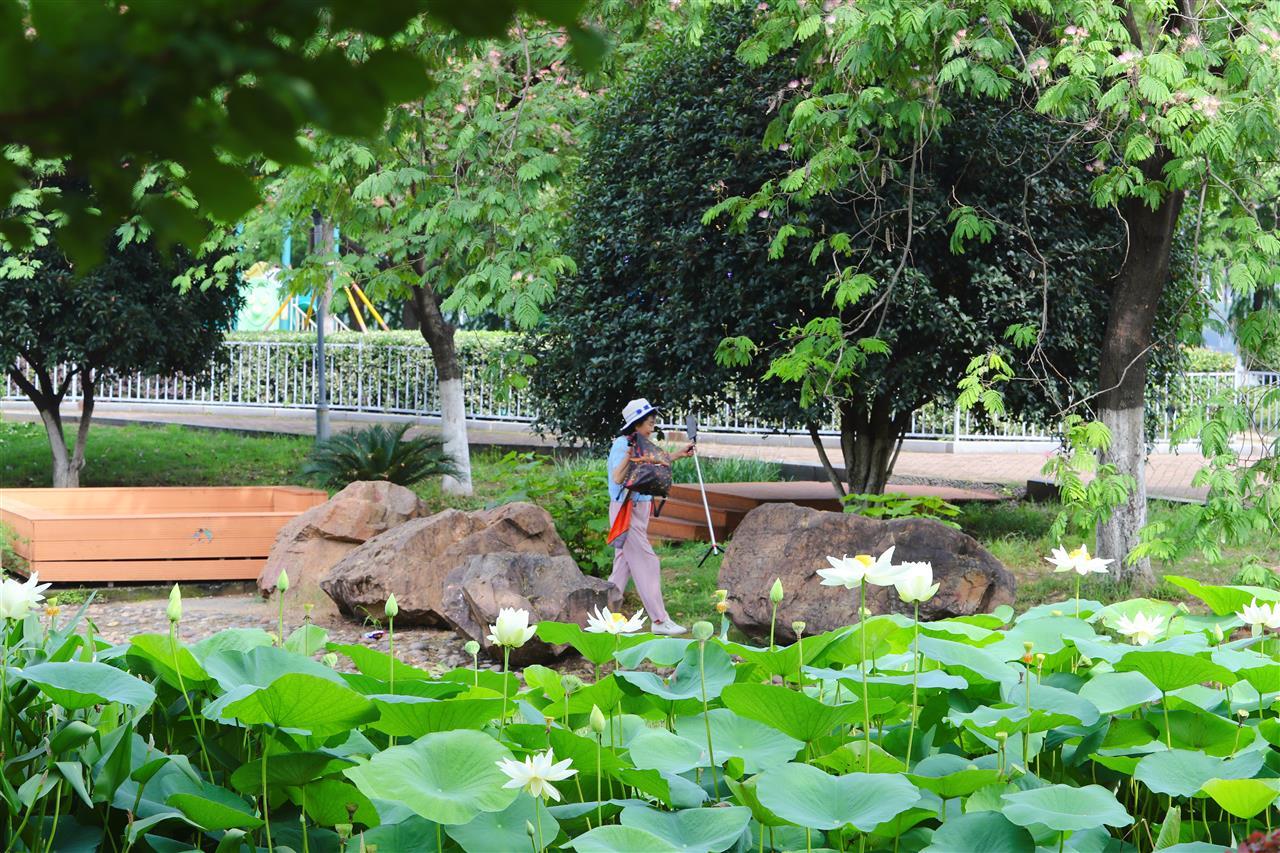 以“小而精”著称的关山公园人工湖,亦有不少荷花。成片浮叶青翠欲滴,初生的立叶微微卷曲,托起今夏的第一波“莲花”。粉荷点缀其间,或含苞待放,或舒展盛放,引得游人驻足流连。除主角荷花外,湖畔的鸢尾、中国花菖蒲、芦苇、美人蕉等植物亦长势繁茂,多重园林元素共同构成一幅生动的生态画卷。