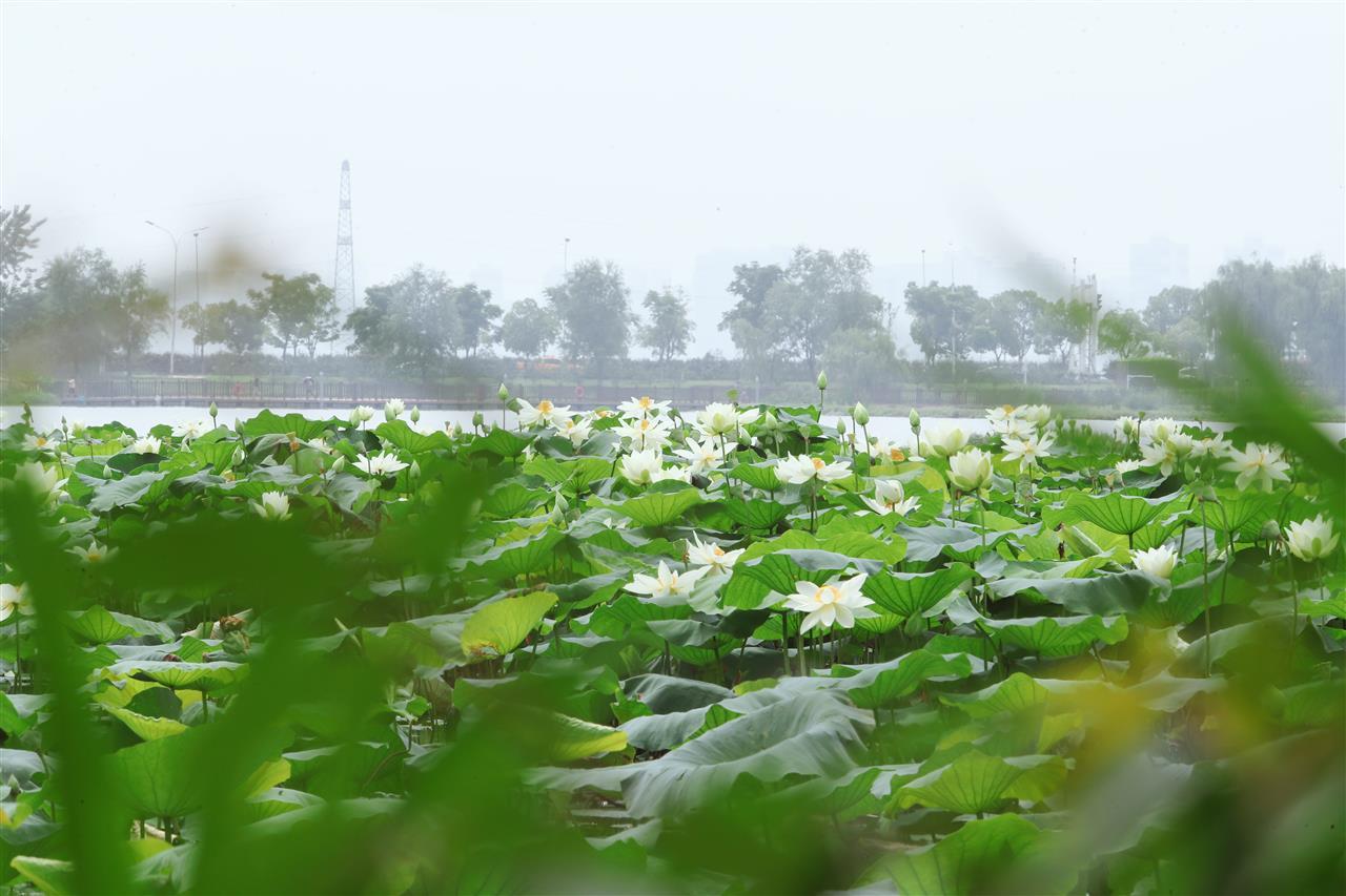 杨春湖公园湿地,则是另一番荷韵。粉荷垂露,盈盈欲滴;白荷带雨,清雅脱俗。尤其在晨昏时分,阳光洒落荷叶,微风吹皱水面,宛如人间仙境。“今年荷花色泽似乎较往年更为鲜艳,可能与今春气温较高有关。”公园养护部刘壮介绍道,“这片荷塘目前由区水务部门负责管养。与荷花相映成趣的还有紫色的鸢尾。粉紫之间,浪漫之至。”
