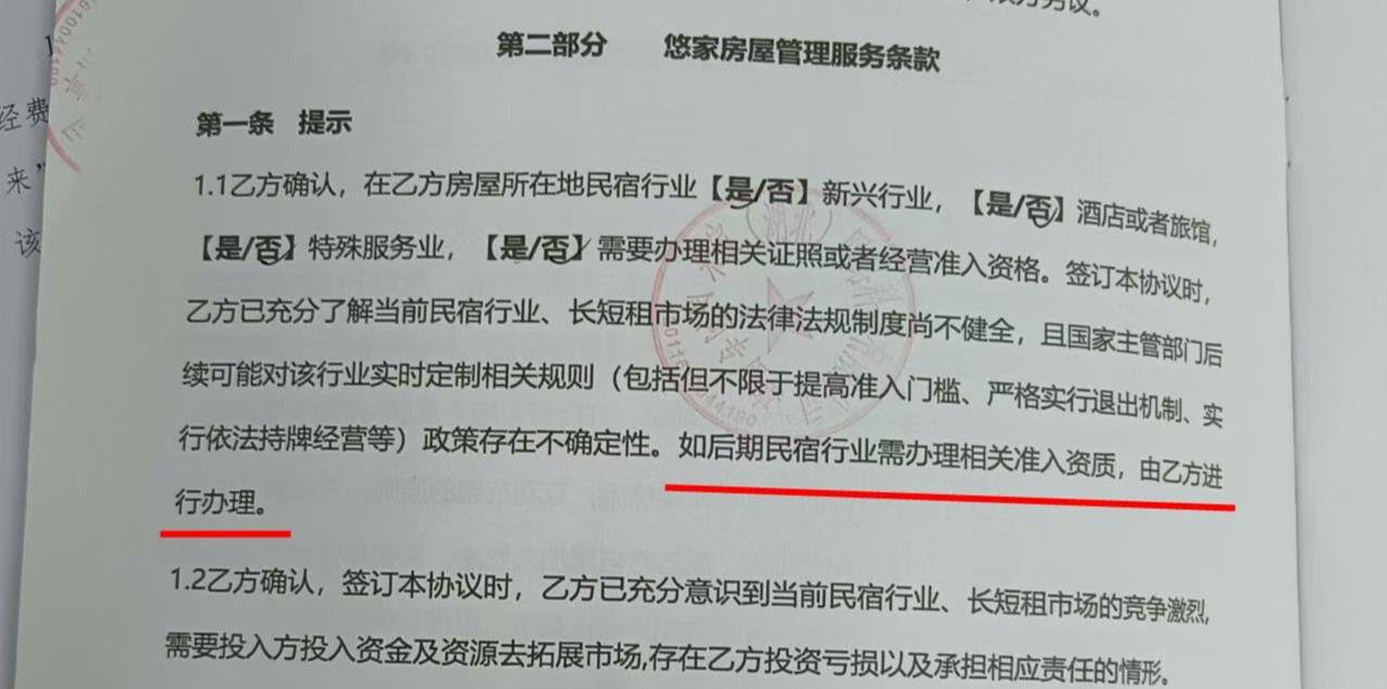 邵女士对记者表示,这一说法她无法接受。“因为签协议时工作人员就给他们看了谁谁付了服务费,谁的民宿很成功,要求在新增房源什么的,并没有提到协议书里的这一条款。”邵女士说。