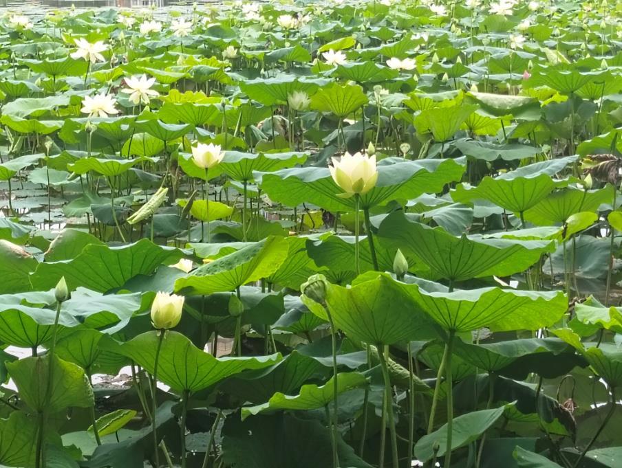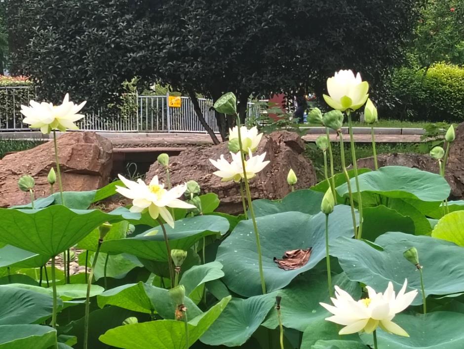 在杨春湖公园湿地,同样是粉荷垂露、盈盈欲滴,白荷带雨,尤其是在清晨或傍晚时分,阳光洒在荷叶上,微风拂过水面,整个场景宛如仙境。“今年荷花好像比往年开花鲜艳一点,可能是春天温度高的缘故。”公园养护部刘壮介绍说,“目前,这一大片荷花属于区水务部门管理。”