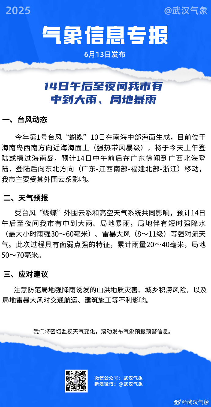 6月13日,武汉气象发布气象专报,14日午后至夜间武汉市有中到大雨、局地暴雨。