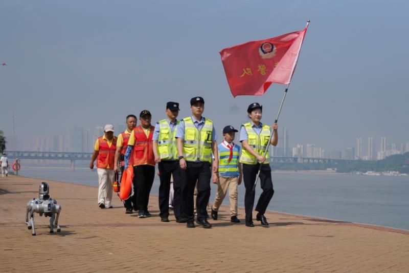 活动最后,少警队员们身着整齐制服,与长江义警并肩开启江滩巡逻之旅。令人眼前一亮的是,两只科技感十足的机器狗加入巡逻队伍。它们憨态可掬的模样,搭配灵活矫健的步伐,时而精准避让行人。路过的市民纷纷被这新奇场景吸引,掏出手机记录下机器狗与义警们同行的画面,欢声笑语中,科技与传统巡逻方式碰撞出别样火花,为江滩景区勾勒出一道独特的“科技风景线”。