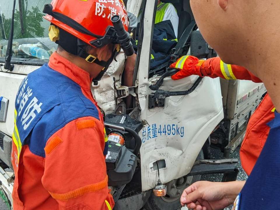 2025年6月10日13时23分,在武汉市蔡甸区白鹤泉东街常福商务广场附近发生一起交通事故,一辆快递货车追尾前车,导致驾驶员被卡在驾驶室。接到报警后,武汉市消防救援指挥中心迅速调派特勤大队特勤三站出动1辆消防车、6名消防员赶赴现场处置。
