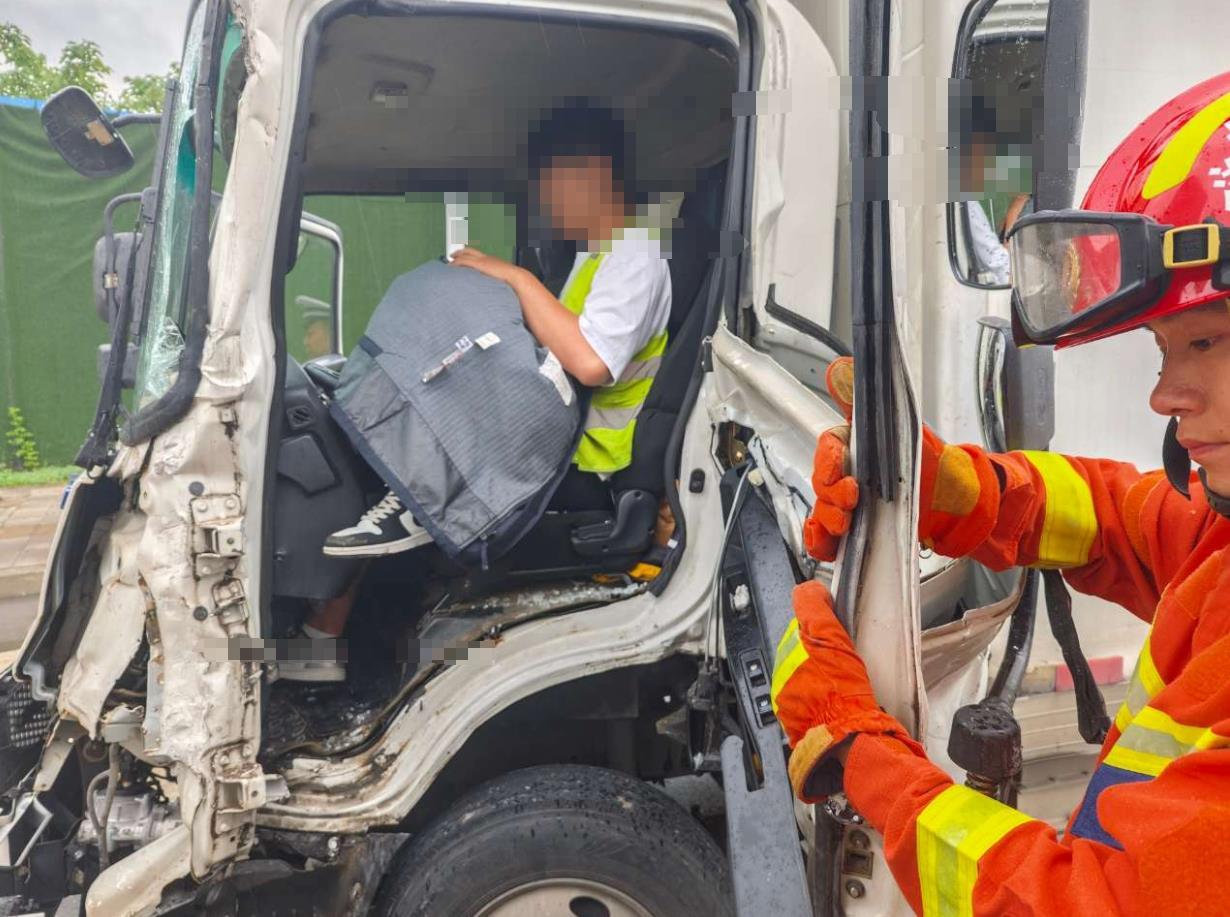 消防员到达现场后发现,两辆相撞的快递货车停在路口斑马线上,其中一辆车驾驶室左侧严重凹陷变形,车门玻璃全部碎裂、散落满地,驾驶员意识清醒,但双腿被紧紧地卡住无法动弹。消防员立刻配合交警对现场实施警戒,并开展救援。