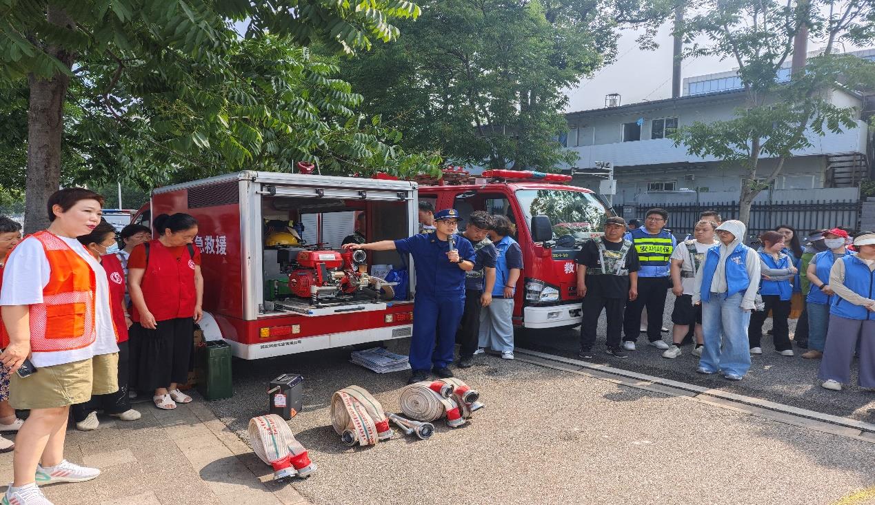 “大家看,发动机、油箱、出水口……水带长20米,逆时针旋转半圈对接好两个卡口,抛法与消防柜的一样。”梅苑消防站的方驰教官详细讲解社区消防车灭火设备使用方法。