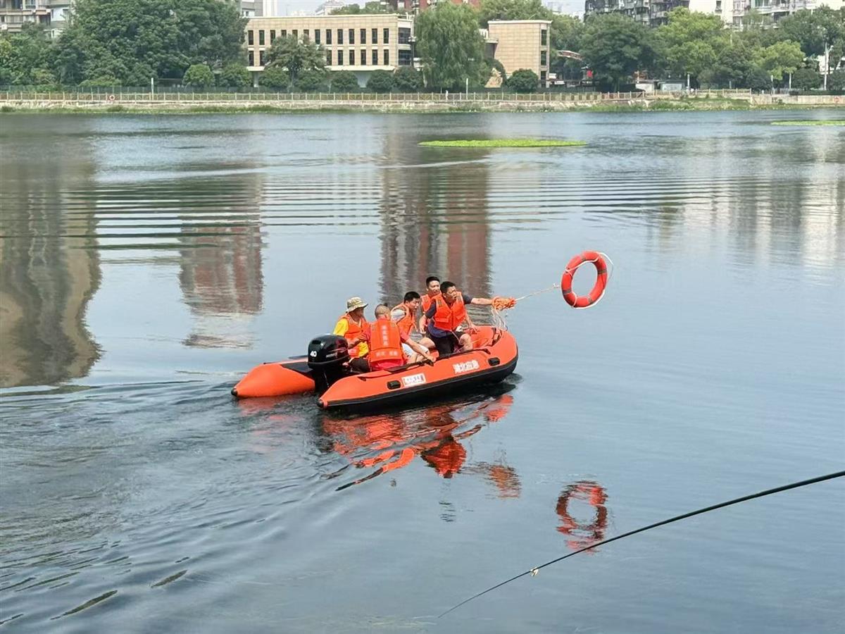 “防溺水”是本次活动焦点,晒湖水面化作生命救援练兵场。皮划艇救援实操演练尤为吸睛,来自四个社区的“水上突击队”迅速集结。长江救援志愿队队员带领民兵连、社区义务消防队、巡湖志愿队、物业单位等组成的小分队,迅速启动发动机,皮划艇如离弦之箭般劈波斩浪。巡湖一圈后,直抵模拟落水区,队员们探身、瞄准、发力,救生圈与救生杆划出精准弧线,稳稳抛向“落水者”。