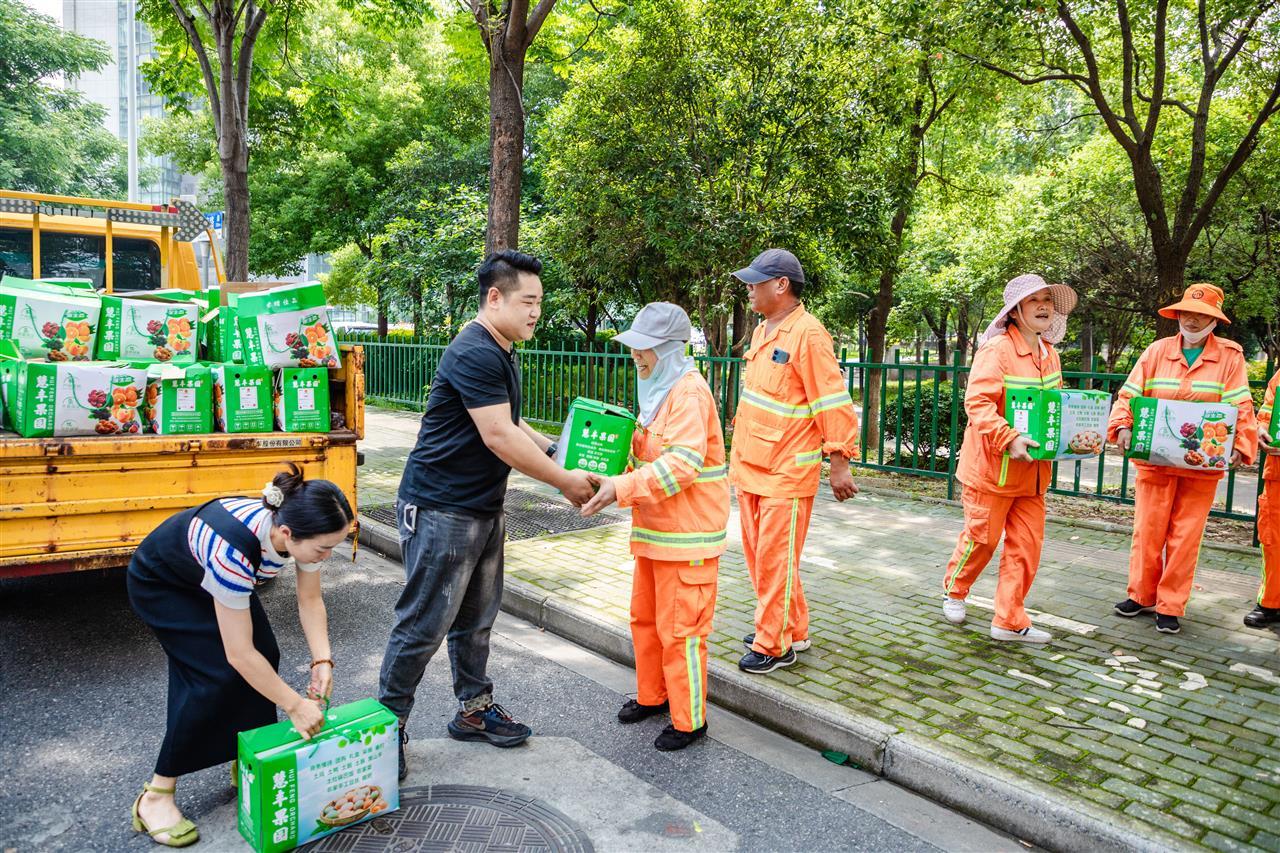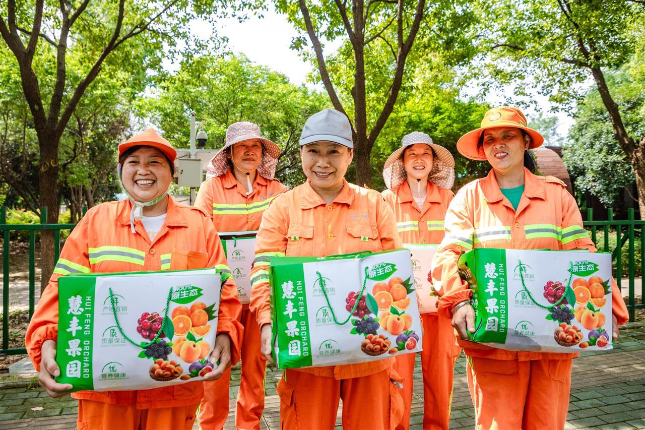 6月15日,武汉市一家爱心企业将2000斤新鲜水蜜桃送至汉阳环卫集团第三公司,为奋战在一线的环卫工人送上夏日清凉。