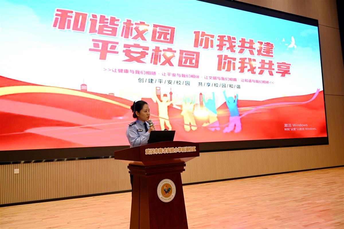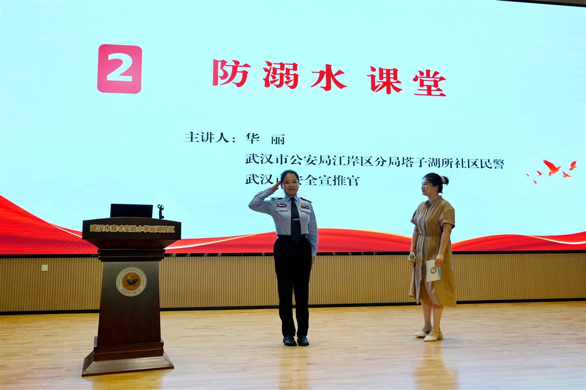 在防溺水安全教育宣讲环节,武汉市公安局江岸区分局塔子湖派出所的社区民警华丽走上讲台,为同学们展示溺水案例警示片。“孩子们,安全不是游戏币,玩水切莫存侥幸!”这句语重心长的叮嘱,深深印在了同学们心中。