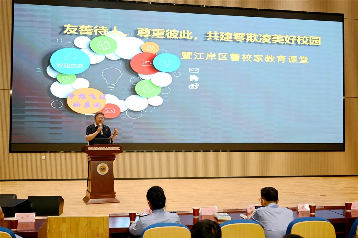 “遇到霸凌时,不能忍气吞声,与家长、老师积极沟通求助,才是保护自己的最好途径。”武汉市公安局江岸分局特邀安全宣传官、华中师范大学人文学院刘学军教授结合真实案例,向在场的同学、家长和老师传授了识别、预防与正确干预欺凌行为的实用方法。