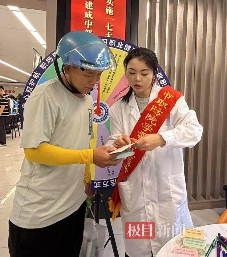 “劳动者职业健康检查费用应该由谁出?”“职业健康检查和普通检查是否一样?”6月17日为蓝骑士关怀日,在武汉市总工会职工服务中心大厅,一群“蓝骑士”正在参与健康义诊,学习急救知识。当天,武汉市职业病防治院医护工作者为“蓝骑士”们带去职业病防治相关科普知识。
