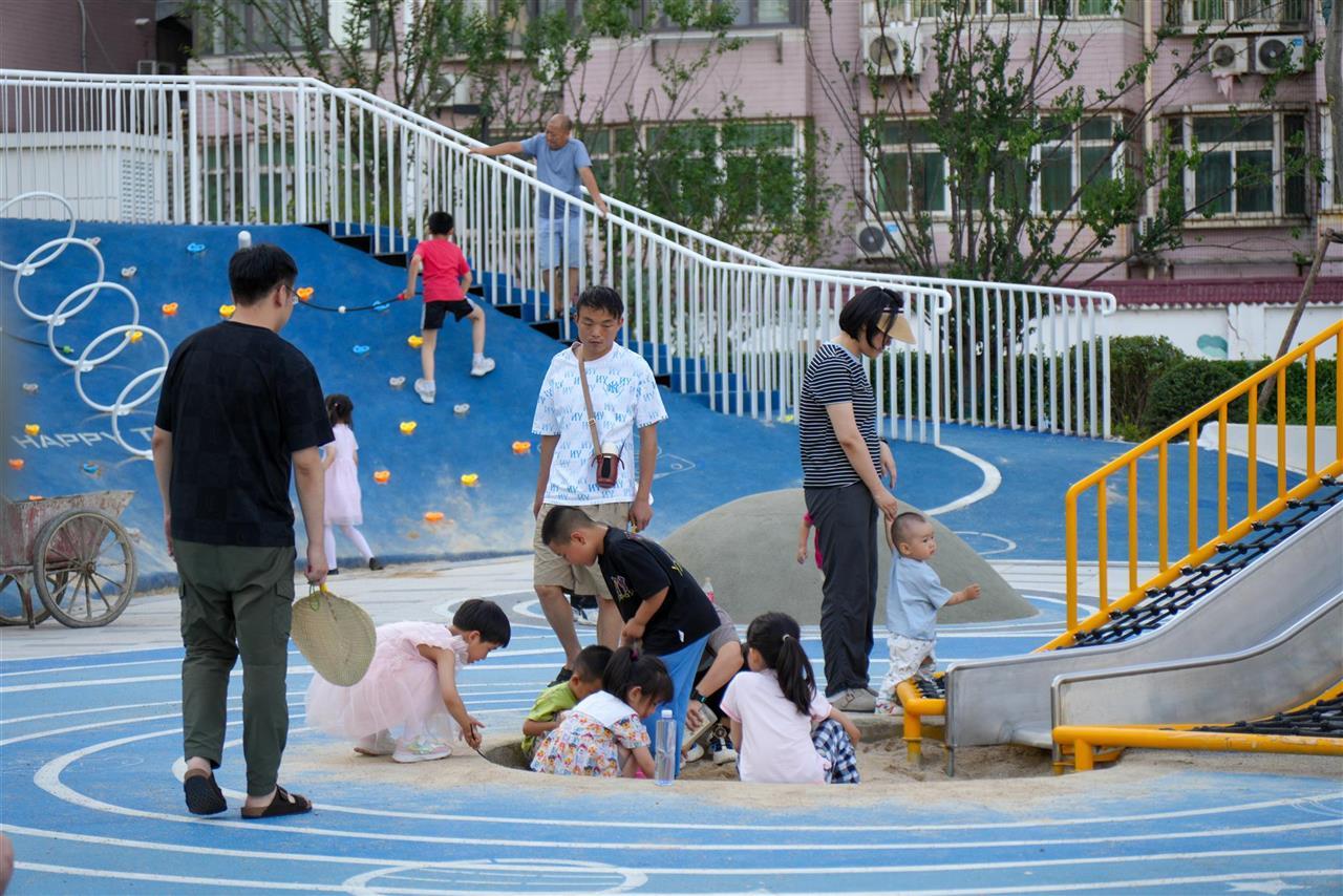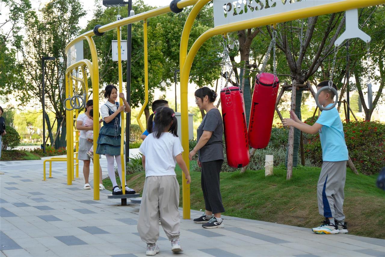 一旁印有“happy walk”的蓝色爬坡上,孩子们或在攀爬,或在玩沙,周边还设有健身休闲区,吊环、沙袋等一应俱全。