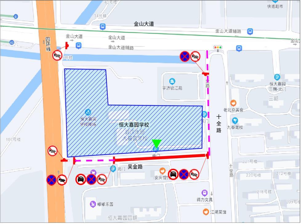 6月20日、6月21日(每日7时至17时30分),6月22日(7时至12时)期间,吴金路(十全路至恒大嘉园小区门口)禁止机动车通行、停放;十全路(金山大道至吴金路)禁止机动车停放、鸣笛;十全路(吴金路至东吴大道)、新城十一路等邻近道路,允许送考车辆单排顺向停放。