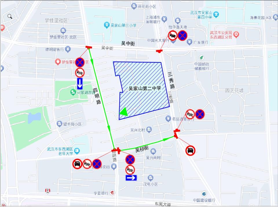 6月20日、6月21日(每日7时至17时30分)、6月22日(7时至12时)期间,四明路(吴中街至吴祁街)实行机动车由北向南单向通行,并视情进行管控;吴祁街(四明路至三秀路)实行机动车由西向东单向通行,并视情进行管控;三秀路(吴中路至东吴大道)、吴中街、四明路、吴祁街等道路禁止机动车停放。