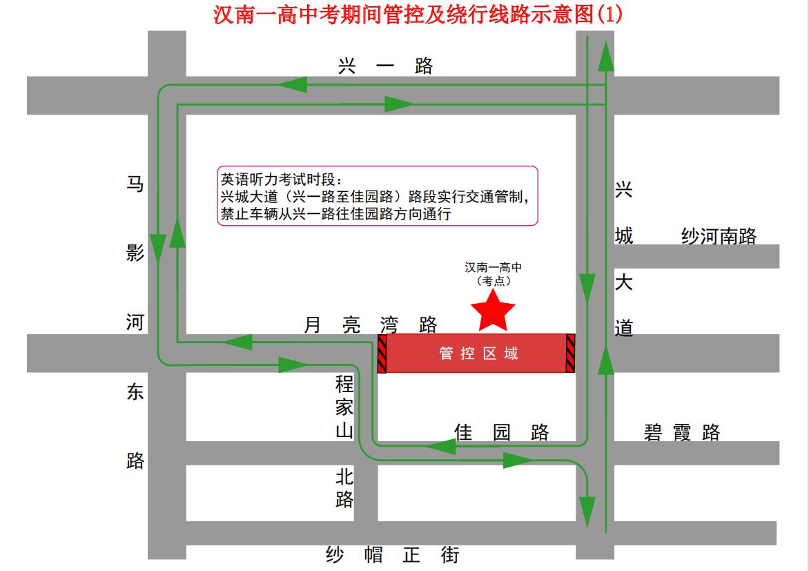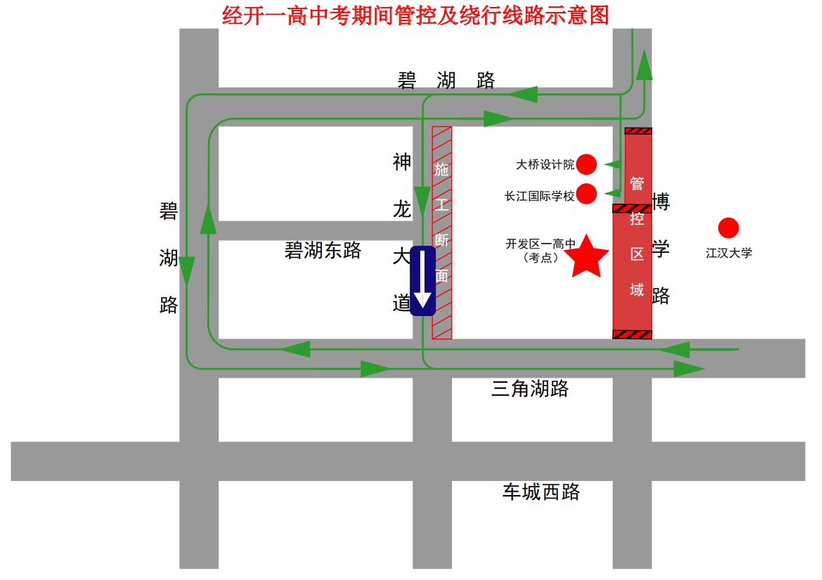 武汉经济技术开发区第一中学周边神龙大道与碧湖路因施工打围,部分路段采取单向通行,请考生及送考家长注意提前规划送考路线,避免因交通拥堵误考。