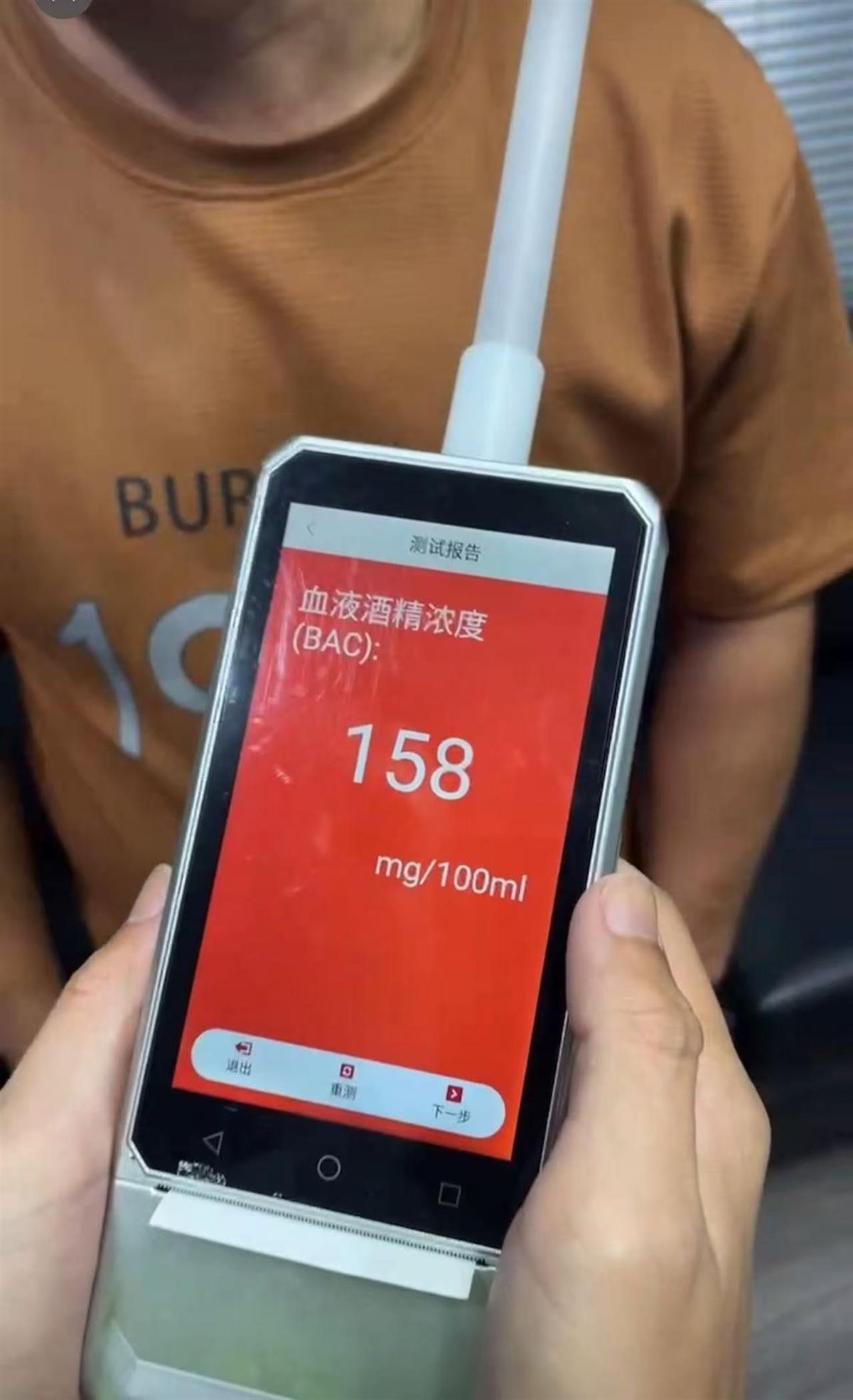 民警叶斌携带酒精检测仪赶赴现场,找到王某的车,随即对王某进行酒精呼气检测,结果显示其酒精含量高达158mg/100ml,远超80mg/100ml的醉酒驾驶标准。