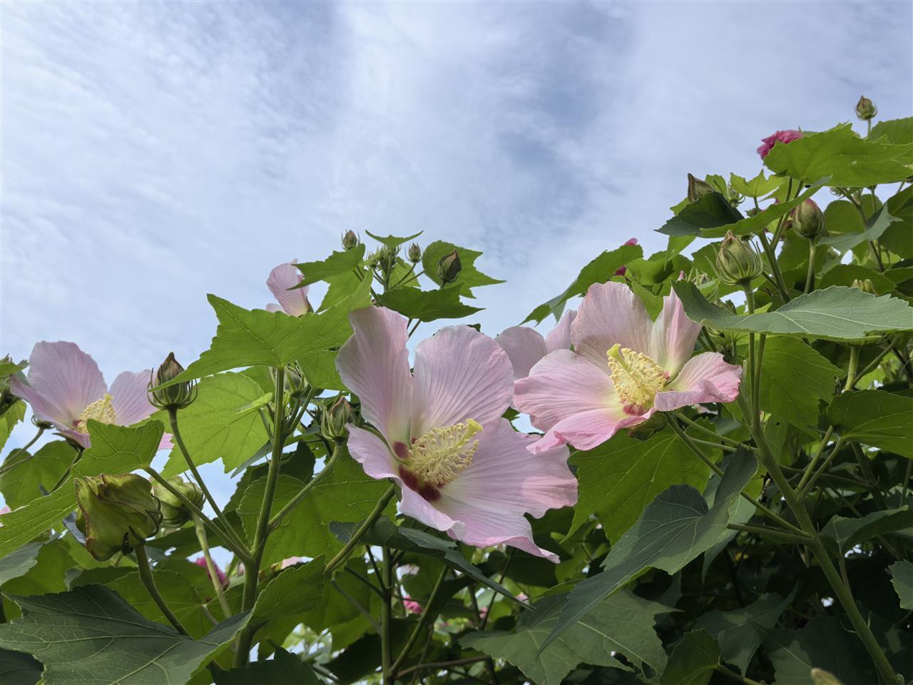 木芙蓉的花朵硕大而艳丽,在绿叶的衬托下显得格外娇俏。微风拂过,花朵轻轻摇曳,散发出淡淡的清香。据了解,芙蓉花的花期一般在每年的7-10月份,其花朵还具有变色的特性,清晨初开时为白色或浅红色,随着光照增强,中午会逐渐变为粉红色,到了傍晚则呈现出深红色,一日三变,令人称奇。