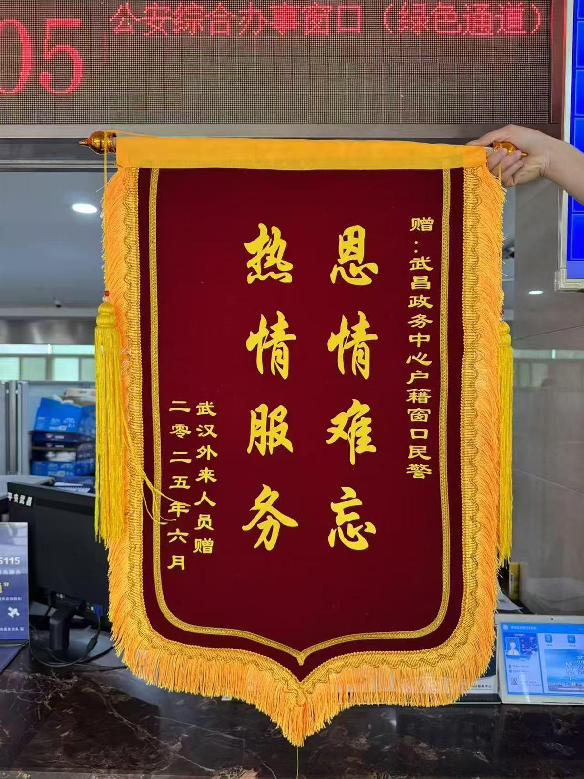 “群众的急事必须特事特办!”办理时限为9个工作日的跨省落户手续,武昌区公安政务窗口民警通过“预受理+容缺办理”机制,仅用了3天就办完了。6月13日上午,当事人李先生委托朋友向窗口民警赠送锦旗,并捎来感谢的口信:“简直是‘八百里加急’!民警们主动服务,让我们全家特别感动。”