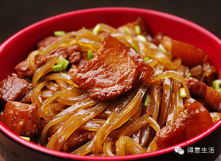 猪肉400克、粉条(干)150克、葱白1根、八角2个、冰糖8克、姜3片、生抽2大匙、食盐1/2小匙、老抽1小匙、花雕酒1小匙、植物油1小匙