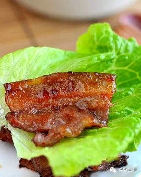 4、平底锅烧热后,刷薄薄一层色拉油。把腌制好的五花肉片两面用中小火煎熟即可,吃的时候用生菜叶卷着吃