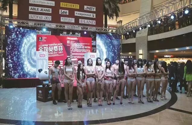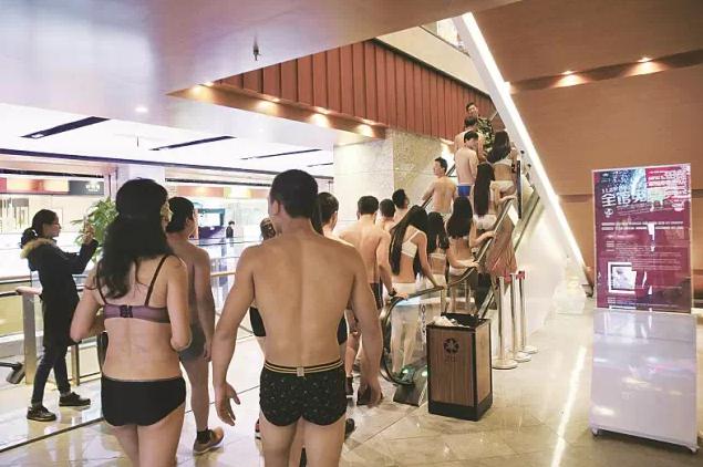 活动规定,当天14点开始,参加活动的前200名顾客(年龄18--40岁),男顾客脱至上身赤裸,只穿底裤,女顾客脱至只穿内衣、底裤,即可在店内参与活动各品牌商户进行免单购物。