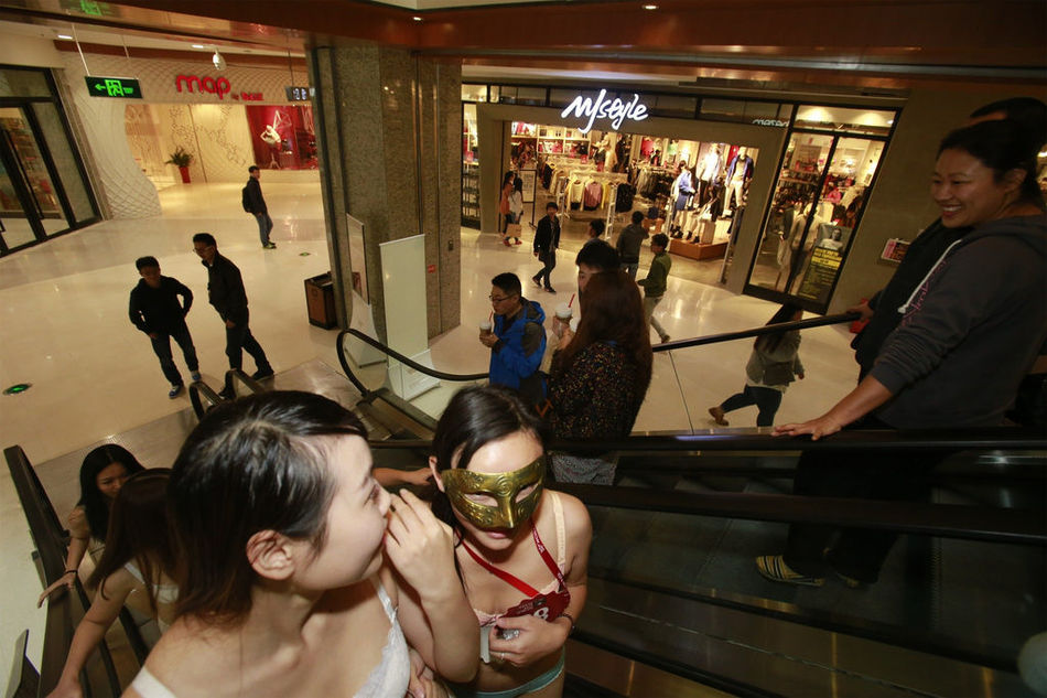 自告奋勇的首拨顾客先后在商场试衣间脱下衣服,戴上遮住眼睛的舞会面具,只穿内衣站在中庭排队,等候集中进场购物。