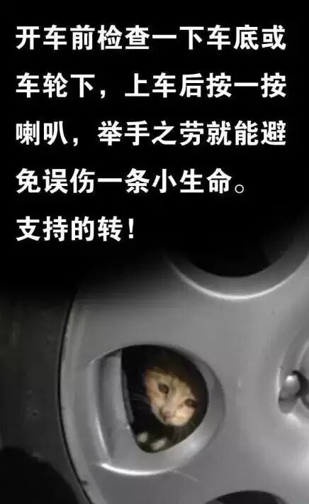 1、冬季来临,请各位车主,开车前检查一下车底或车轮下,您的一个小动作,也许换来的是一条无辜的小生命;