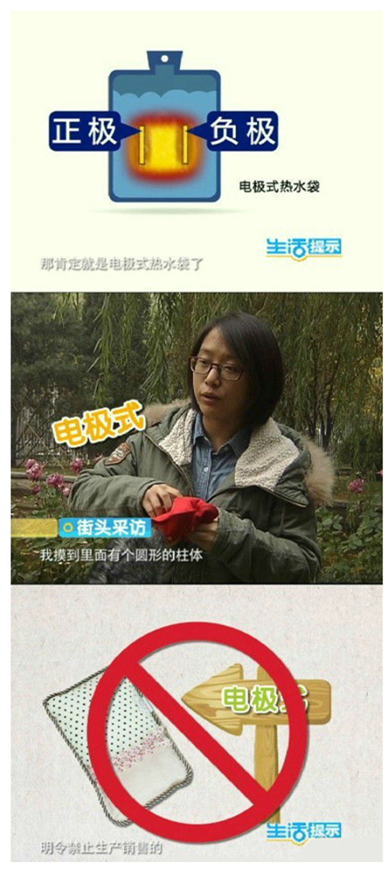 专家说电极式热水袋易发生爆炸。购买时可用手轻轻捏一下热水袋,如果捏到两截硬邦邦的圆柱体,那肯定就是电极式热水袋,最好不要购买!