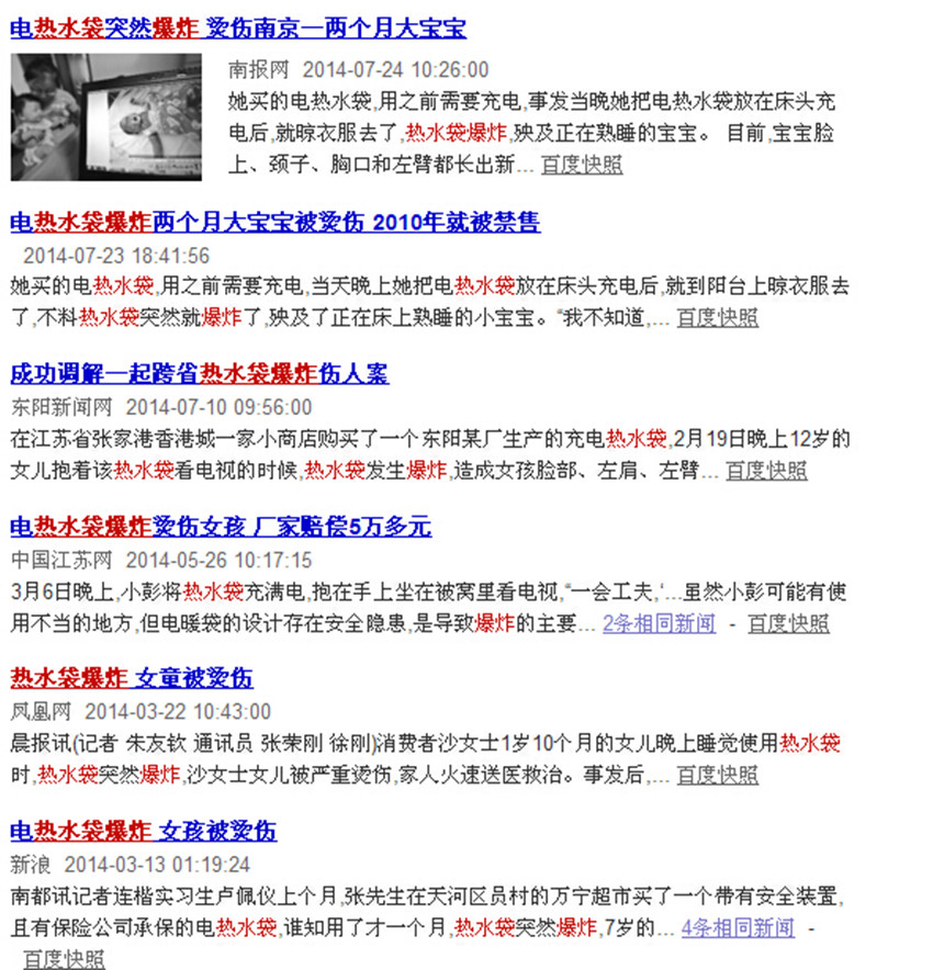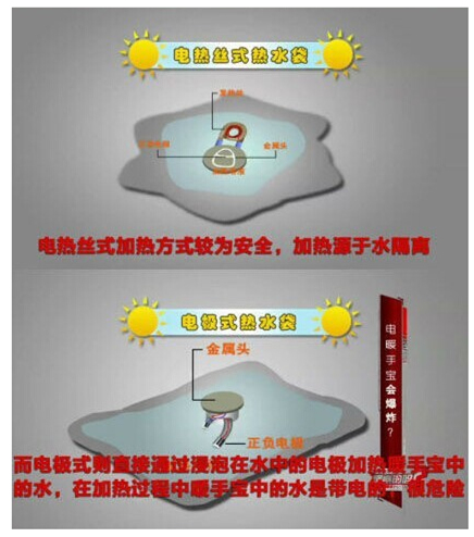 电极式热水袋存在严重安全隐患:由于其电解质溶液是处于带电工作状态,因此一旦发生漏液,便有触电危险;另由于电极直接和液体接触,电能转换为热能的效率较高,又无温控装置,通电之后热水袋膨胀得很大,便容易发生爆炸。