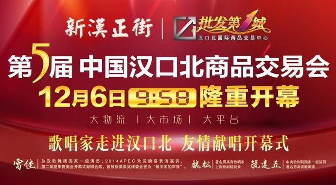 12月6日,第五届中国汉口北商品交易会即将隆重举行。400万方展区,20大市场携百万商品联合大展销,各类促销活动精彩纷呈,1元换购、1元秒杀,百团大战、到店有礼、购物有礼、抢红包、砸金蛋……商家集中让利钜惠全城,吃喝玩乐购全覆盖,力求为市民呈上一场互动性强且实惠多多的狂欢嘉年华。除此之外,开幕式上,三大著名歌唱家友情献唱,新丝路冠军超模领先时尚走秀,为市民带来一场高雅、时尚、潮流的艺术盛宴。