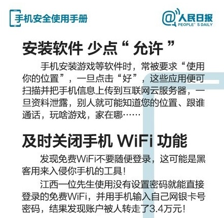 江苏扬州一市民的银行卡在不到2天内,竟交易69笔,6万元钱不翼而飞,警方发现,可能跟他曾在公共场所连接wifi有关。移动互联网时代,手机正变成我们的记事本、账本、钱包……与之相关的危险也越来越多。本周,中国首届网络安全宣传周。最全手机使用安全手册↓↓↓扩散!