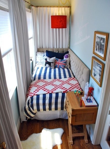 像这样把小床搬到阳台,也是解决小户型空间不足的好办法。阳台安装储物柜。