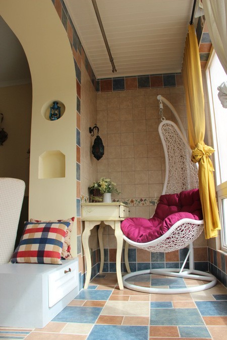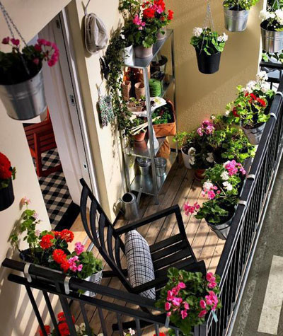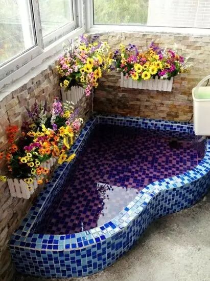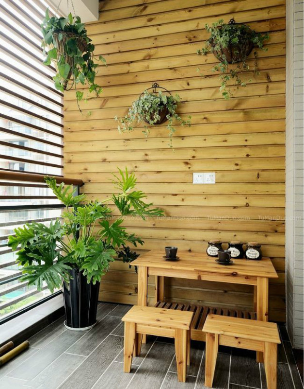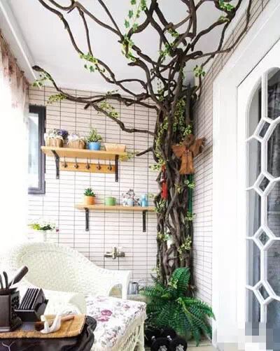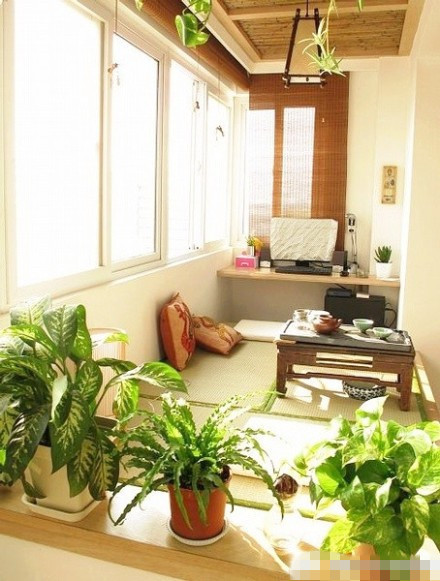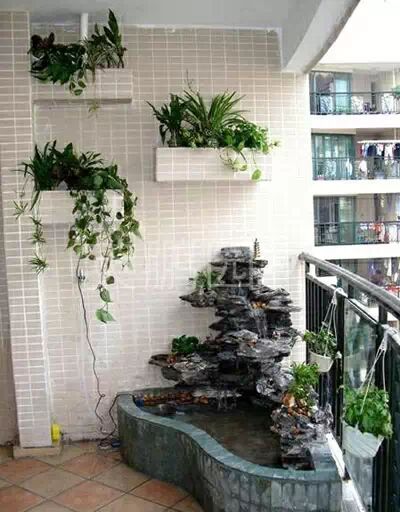 在阳台外侧装一铁架,错落有致地置上各种盆栽花木;在阳台内侧和扶栏上置上一些山水盆景;阳台两侧可搭架种植几株牵牛花、长春藤等攀藤植物;较为宽阔的阳台还可在中央砌一小型工艺型喷水池,池内可置些假山贝壳,养些观赏龟、小鱼小虾之类的水族,使整个阳台上有绿叶相掩,下有花卉相映,池中鱼逐虾戏,不出家门就可尽情享受到大自然的乐趣。