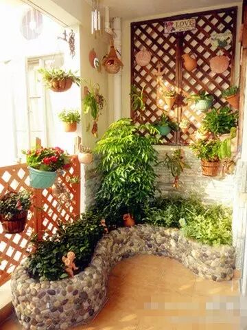 鹅卵石砌成的小花坛不规则的占据了阳台的一角,茂盛的绿植使阳台充满了生命力。