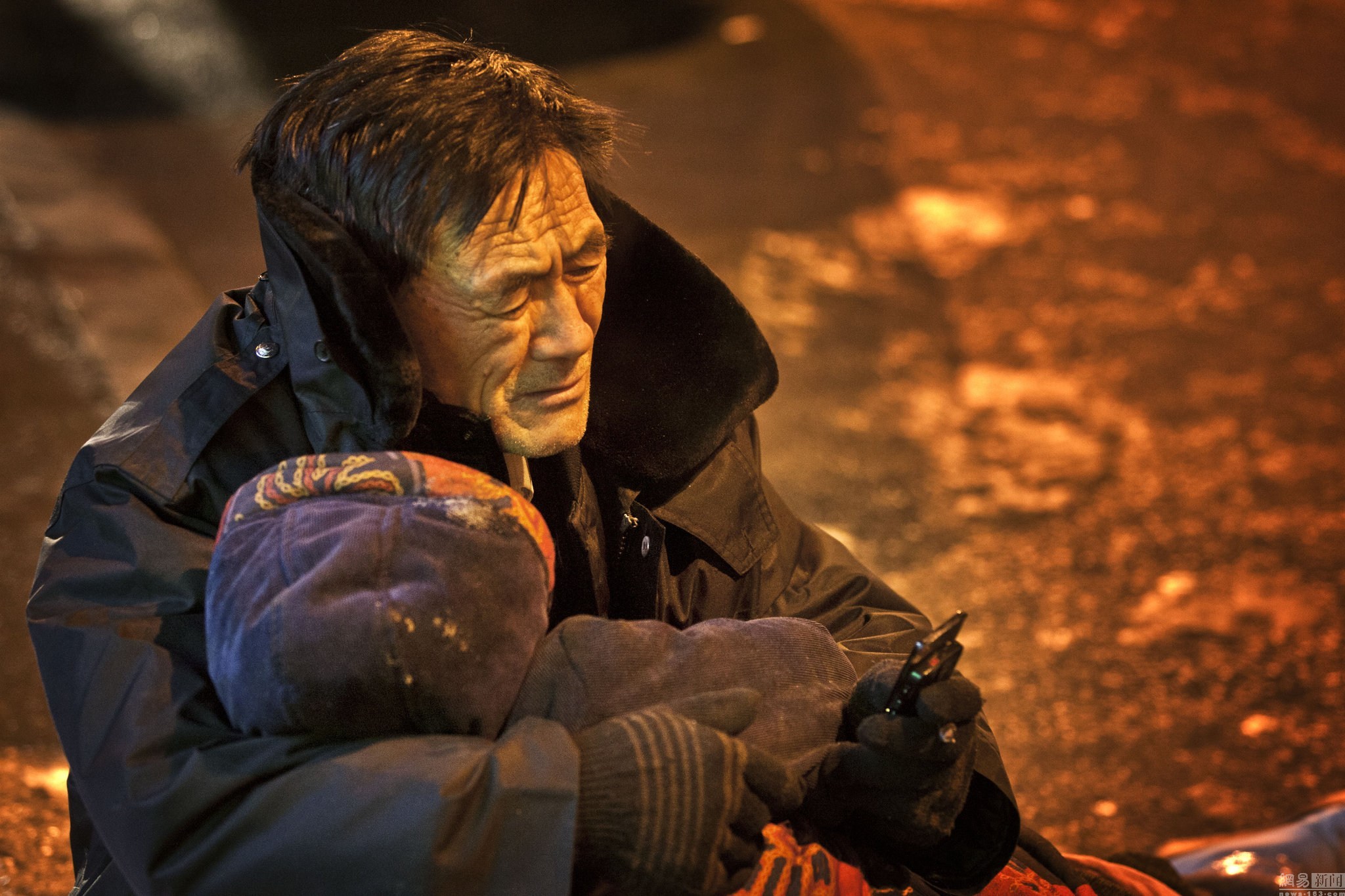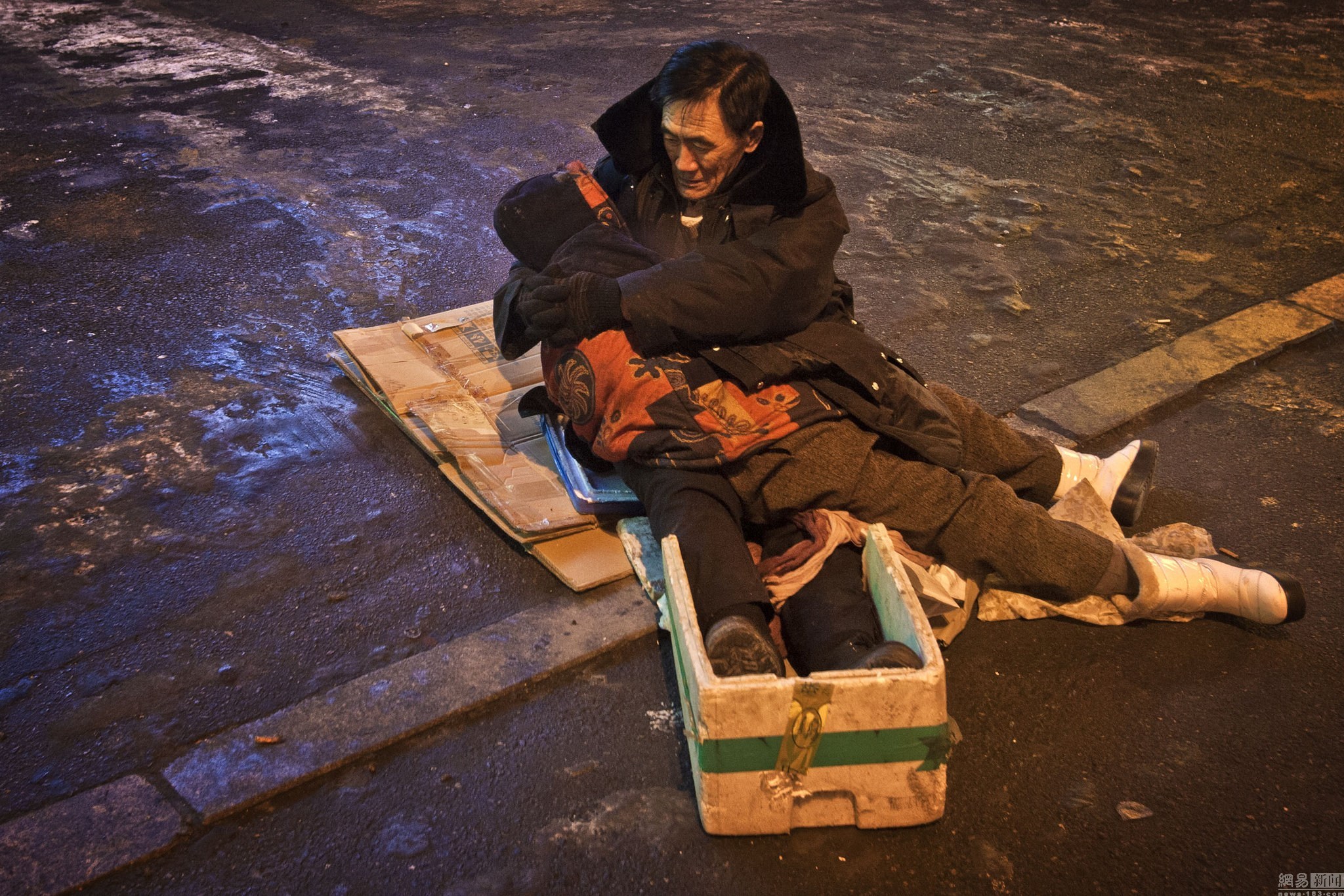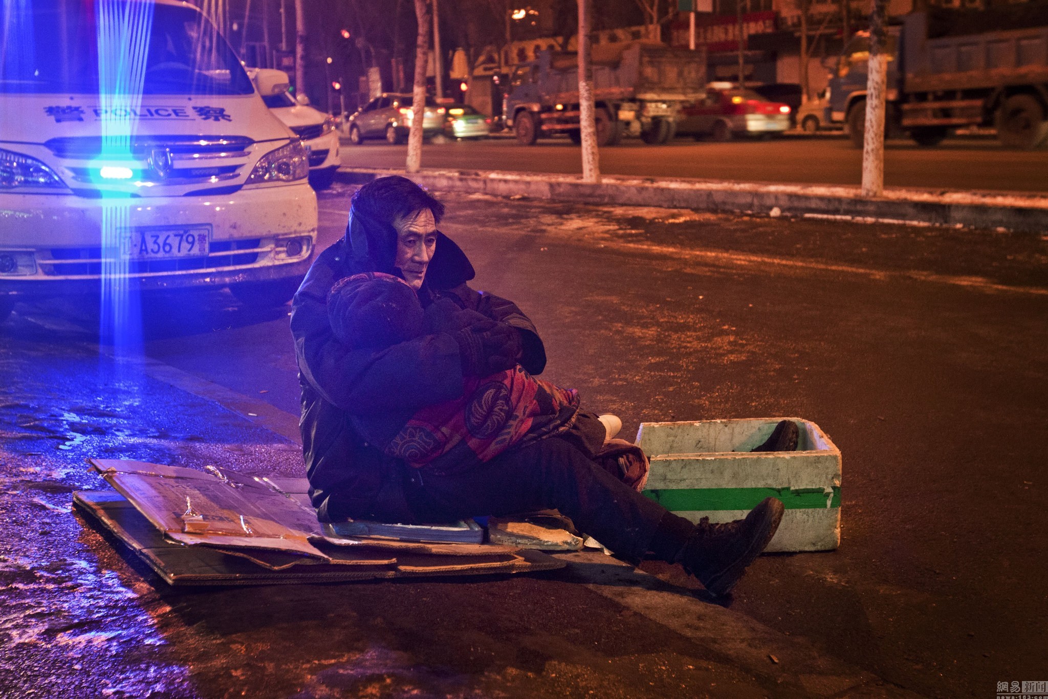 2014年12月17日,19时50时许,辽宁沈阳市沈河区奉天街与沈州路交会口东侧,一名戴黑帽子、穿黑棉袄的大爷坐在人行道上的一块纸板上,怀里抱着他突发心梗离世的老伴。住在附近的所先生说,17时40分左右他就发现大娘躺在地上。18时左右,120赶到后确定老人已经死亡,死亡原因初步认为是心梗。而大爷是在快19时赶到老伴身边,自打到这儿就一直抱着老伴没松开过。