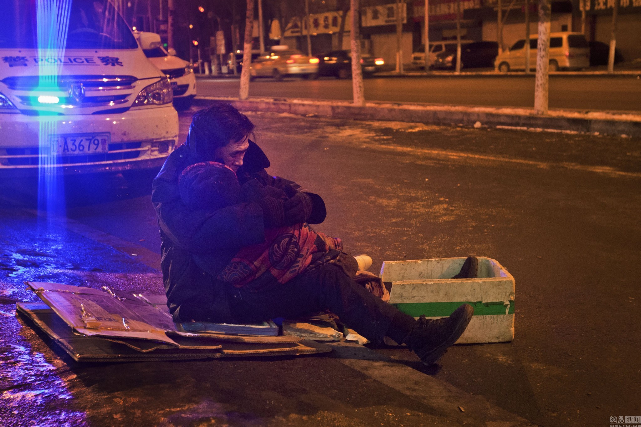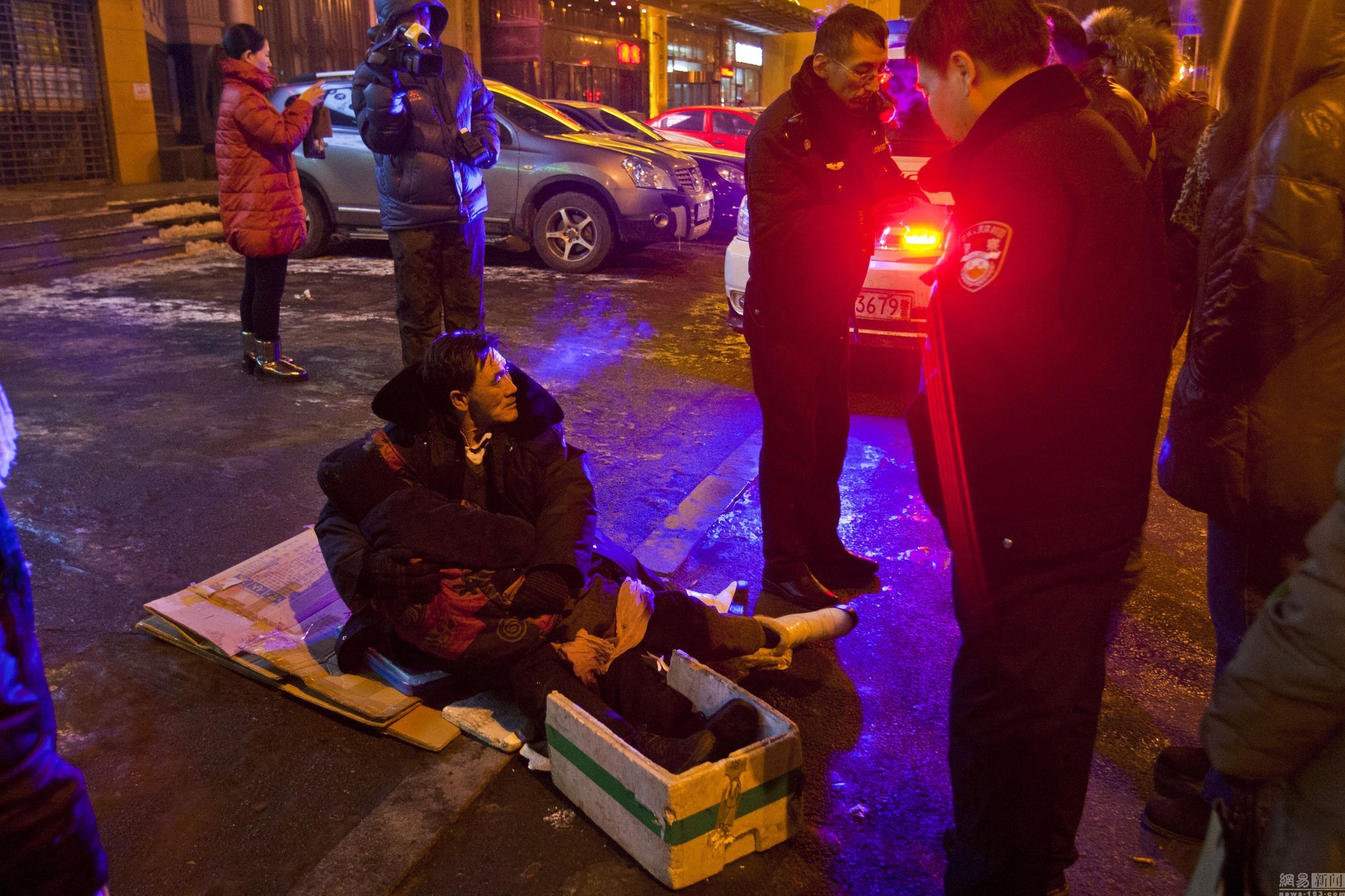 所先生说,何大爷刚到时没戴手套,坐着不到10分钟双手就冻得发红,他赶紧回家给大爷取来了手套,拿来了纸板和泡沫箱,让他坐在身下隔凉。已经抱着老伴坐了快两小时的何大爷已被冻得浑身僵硬、脸色苍白。