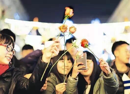 图为:汉街上的几位女生,手举玫瑰,祝福自己。图片来源于《楚天金报》记者刘蔚丹摄