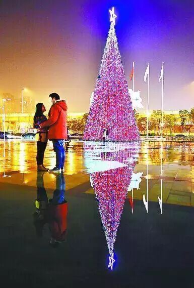 昨晚,一对情侣站在欢乐谷的圣诞树下。《武汉晚报》见习记者周迪 摄
