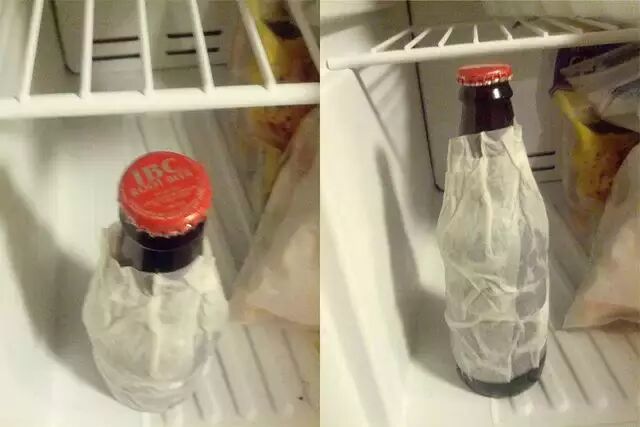 13. 纸巾除了清洁,还可以帮助降温:把它浸湿,然后裹在饮料瓶上,冰冻 15 分钟,就能得到透心凉的饮料了。