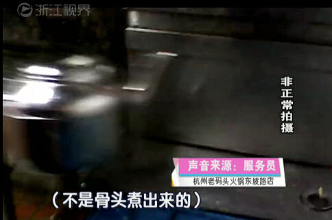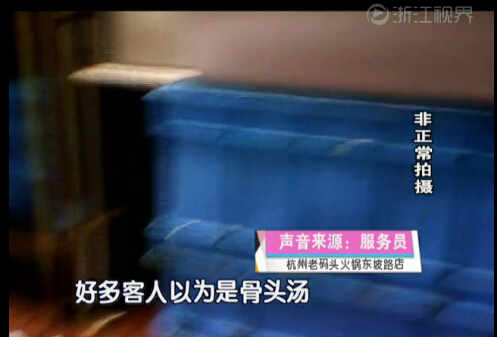 原来服务员口中所说的骨头汤,其实就是用这种熊猫牌植脂蛋奶勾兑出来的,而植脂蛋奶实际上是一种做奶茶咖啡时用的添加剂。锅底端上餐桌,传菜的工作就开始了。客人点菜后,配菜间里的厨师把菜拼盘搭配,然后再由传菜员从配菜间里把菜送到客人那里。而传菜员在回到配菜间时,还兼有另外一个重要的工作内容。