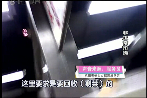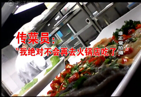 记者发现,在回收的菜品中,除了吃剩下的金针菇、白菜之类的蔬菜外,还有毛肚、鹅肠、黑鱼片这样的荤菜。但是之前的体验调查中,对客人的剩菜,服务员的说法是直接倒掉,而现在在记者面前这些回收的菜盘,却全都是客人吃剩的。传菜员语气显得很无奈,甚至说自己再也不吃火锅了。